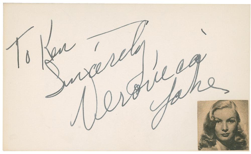 Vintage in-person fountain pen signature and inscription, “To Ken, Sincerely, Veronica Lake,” on an off-white 5 x 3 card, with a small clipped photo affixed to lower right corner. In fine condition.