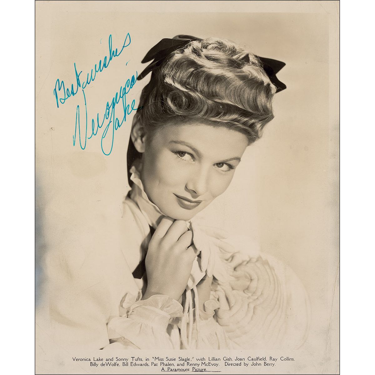 Vintage glossy 8 x 10 Paramount promotional photo of the actress for the film Miss Susie Slagle’s, signed in fountain pen, “Best wishes, Veronica Lake.” In very good condition, with edge toning, scattered creasing and surface marks, a paper clip impression to the top, and a few trivial finger print marks. An adorable photo of the young, fresh actress.