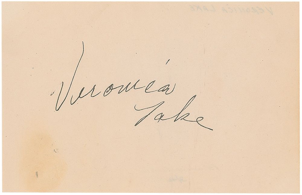 Vintage ink signature, “Veronica Lake,” on an off-white 5.75 x 3.75 album page. In fine condition, with light show-through from notations on reverse and a small spot of toning to lower left.