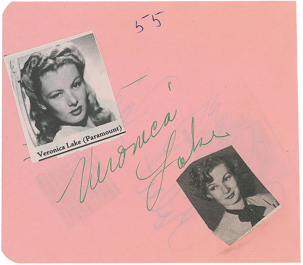 Vintage green ink signature, “Veronica Lake,” on a pink 5 x 4.5 album page with two newspaper photos affixed near the signature. In fine condition, with some show-through from signature and photos on reverse.