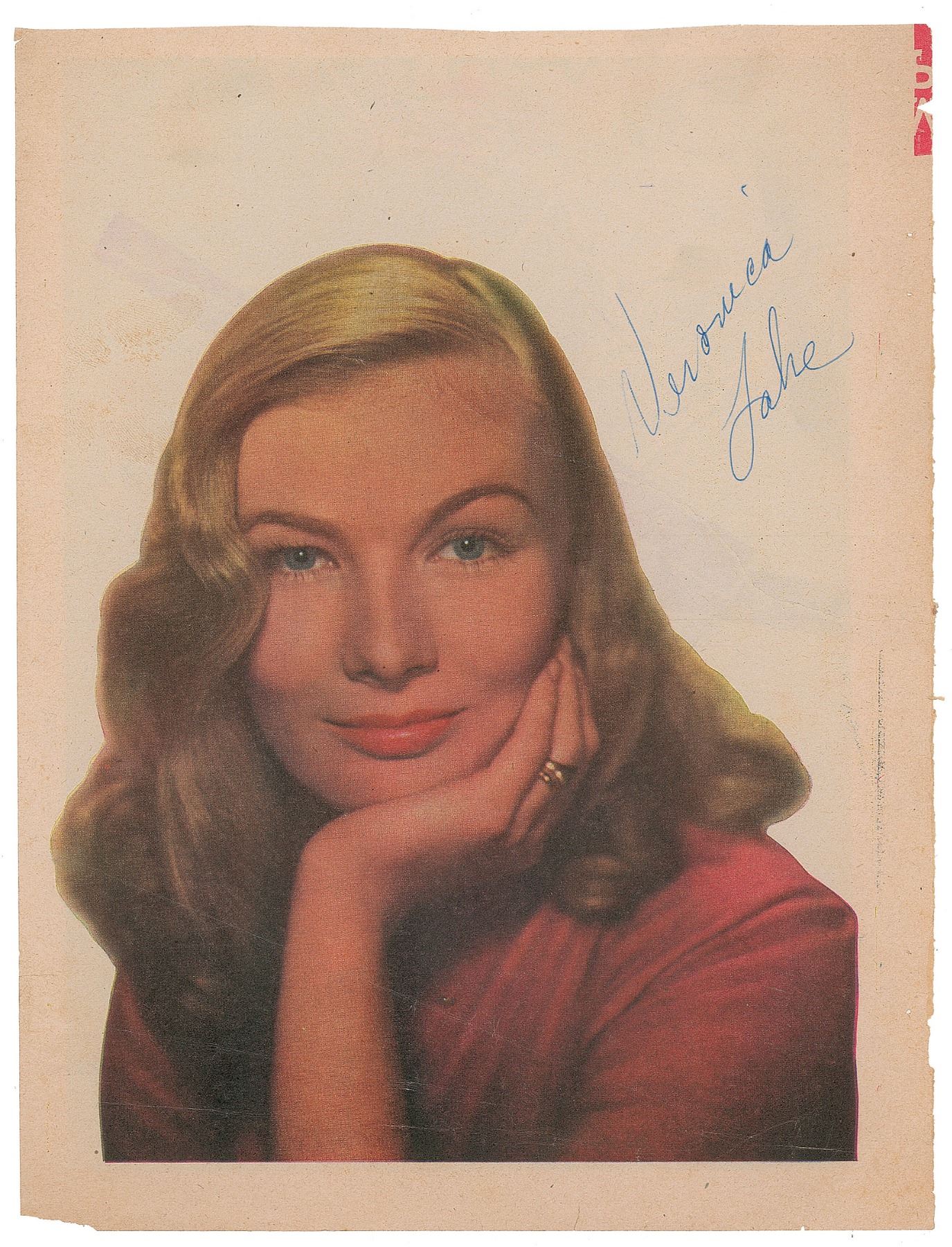 Color 8.5 x 11 magazine photo of Veronica Lake in a lovely up-close pose, signed in blue ballpoint. In very good to fine condition, with creases across the lower part of the image, and a somewhat unobtrusive tear across the upper part (passing through Lake's forehead), repaired with tape on the reverse.