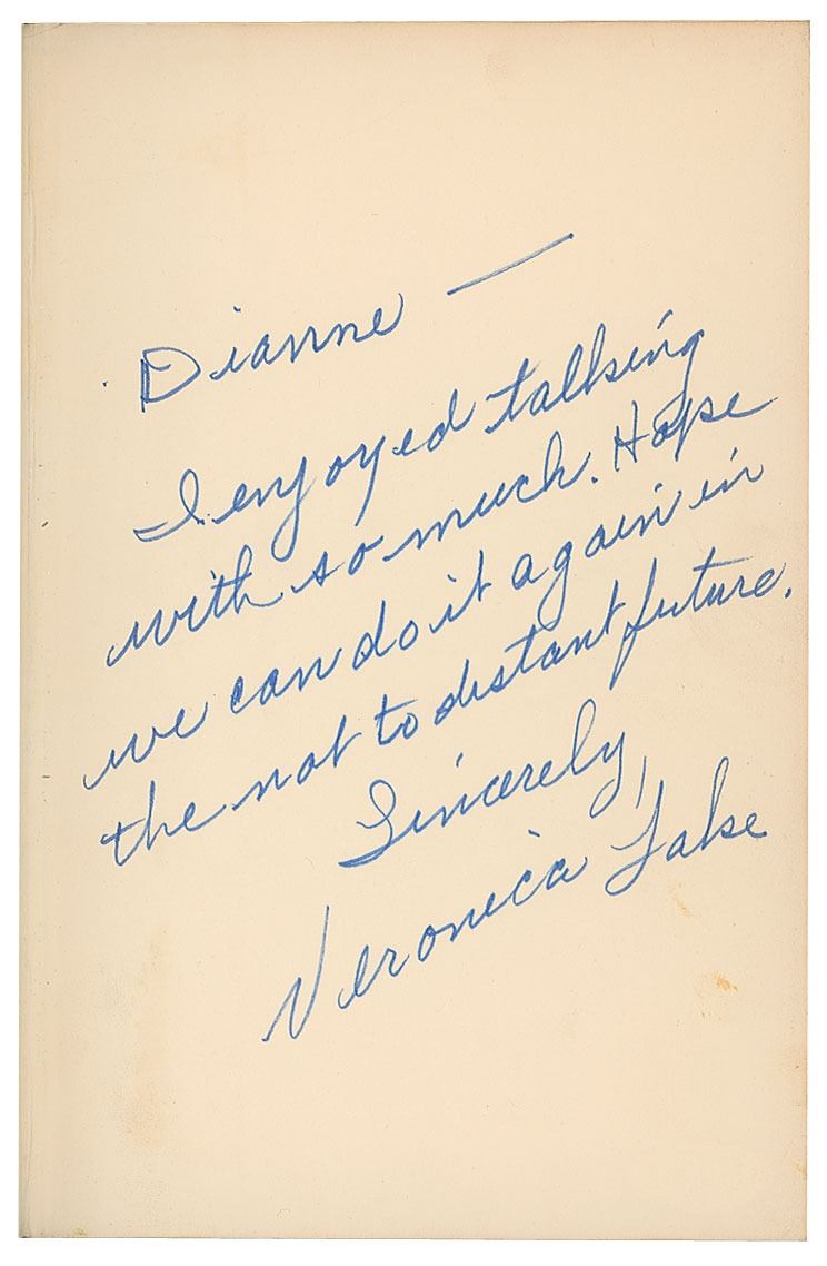 Signed book: Veronica: The Autobiography of Veronica Lake. First American edition. NY: The Citadel Press, 1971. Hardcover with dust jacket, 5.5 x 8.5, 281 pages. Signed and inscribed on the first free end page in felt tip, "Dianne—I enjoyed talking with [you] so much. Hope we can do it again in the not to[o] distant future. Sincerely, Veronica Lake." In fine condition, with some wear to the dust jacket and a JSA label affixed to reverse of signed page.