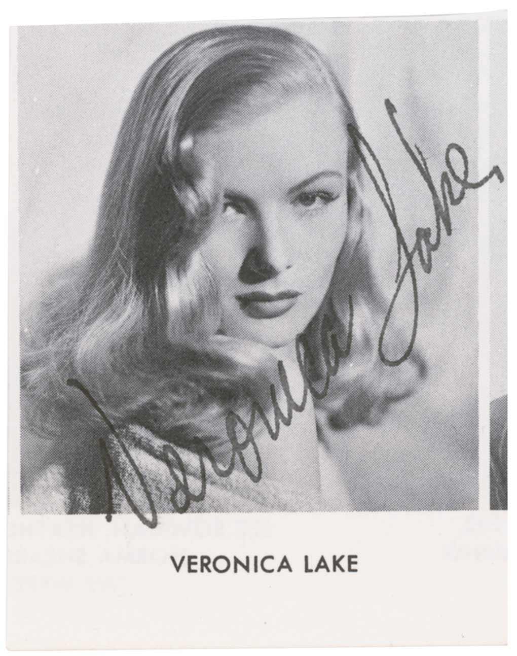 Vintage clipped 2.5 x 2.5 book photo of Lake displaying her peek-a-boo hairstyle, signed in fountain pen. In fine condition.