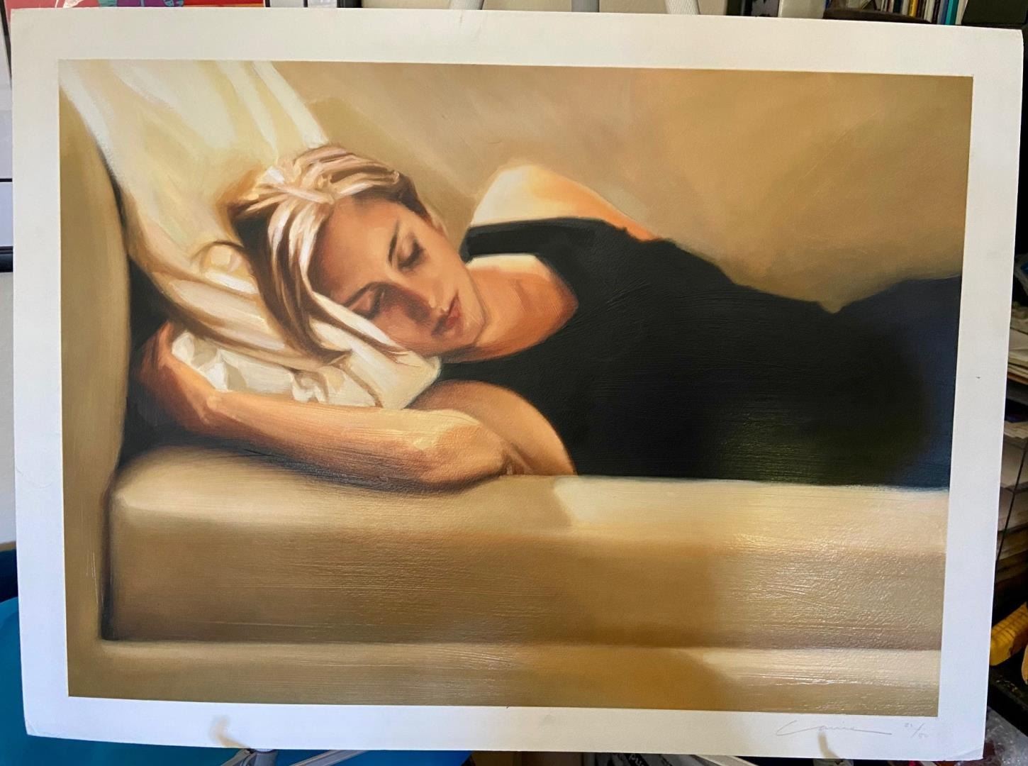 A sweet & sultry limited edition serigraph on rag paper 23x31". Margin corner a bit dogeared, but will be under frame. Image 20x28" # 21/50 signed by Carrie Graber