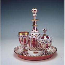 "Verre d'eau" en cristal color doblado con decoración gótica. Trabajo francés, segundo cuarto S. XIX. Diámetro bandeja: 31,5 cms. Altura licorera: 33,5 cms.
