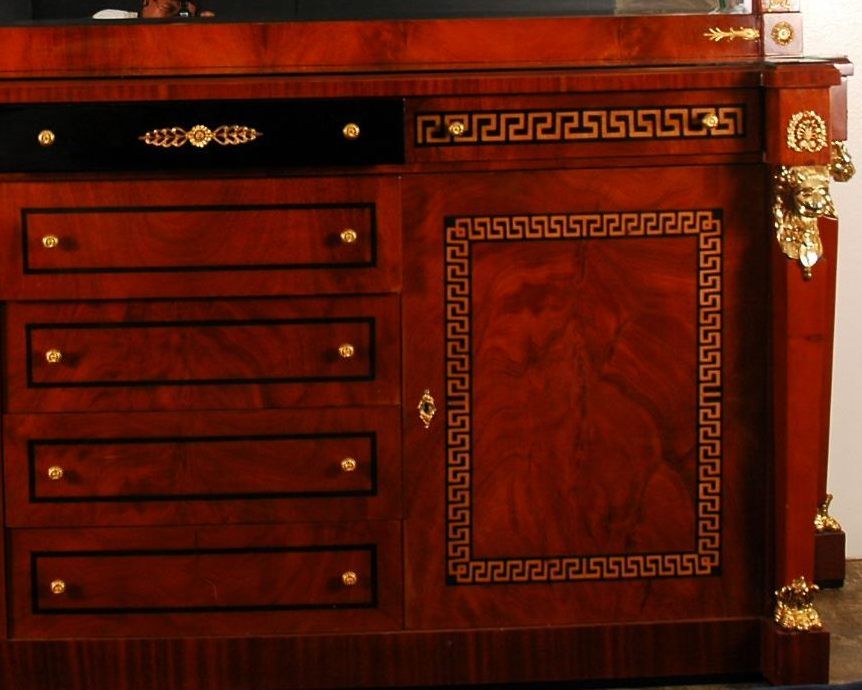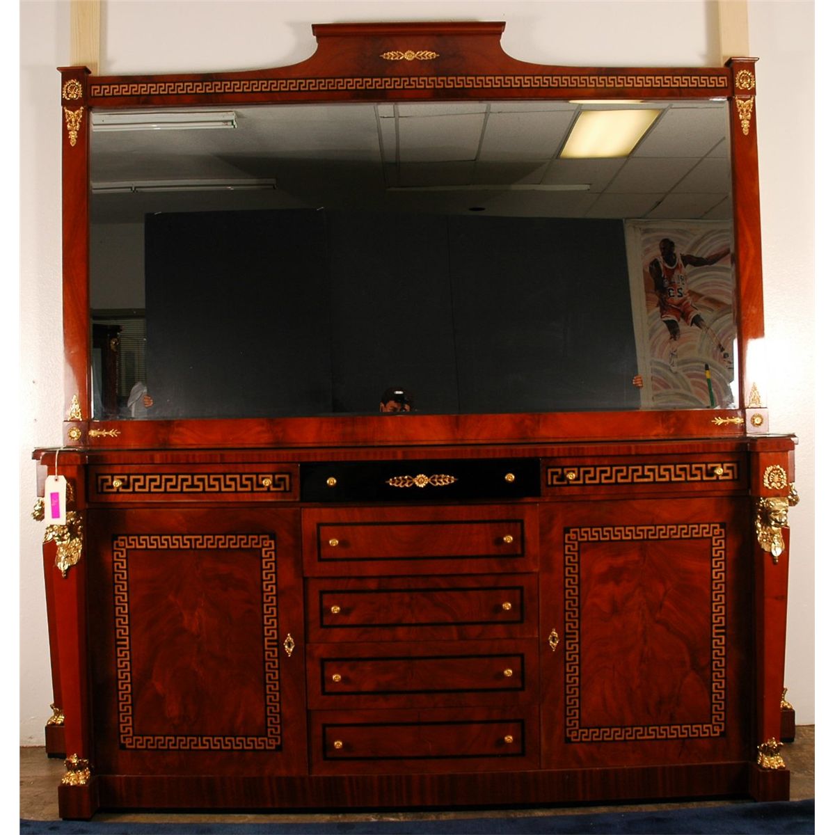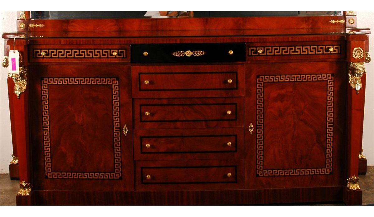 Multicompartment lacquered wooden Versace style buffett with classic Versace decor. Golden lions, golden knobs, with black laquered accents and goldleaf accents. Glass top. Buffet 38" x 91", mirror 50.5" x 85".