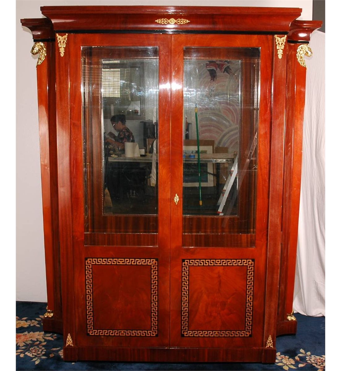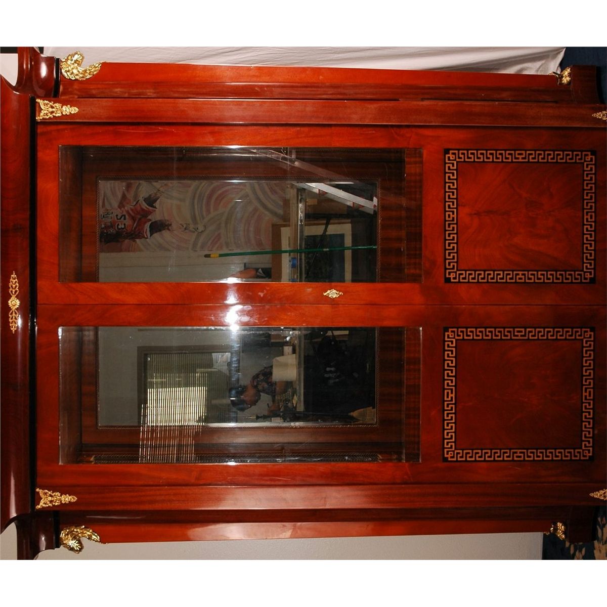 Monumental Versace style wooden lacquered china cabinet with double glass doors. WIth goldleaf and black accents in classic Versace design. 78" x 66".