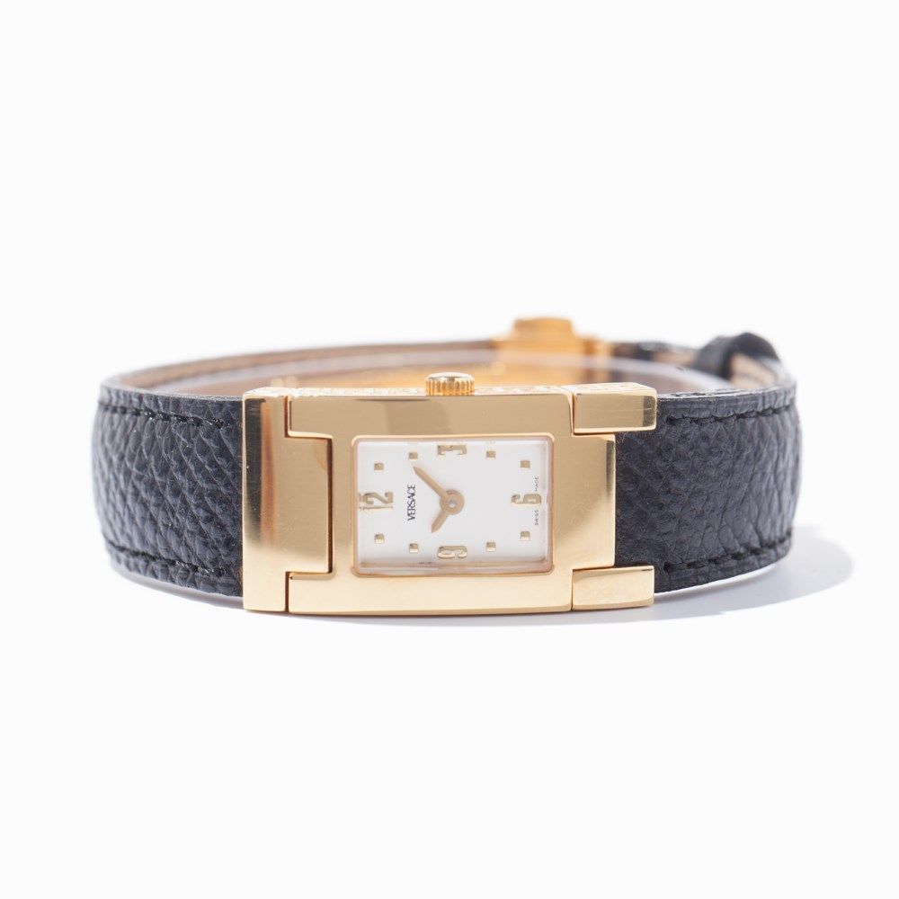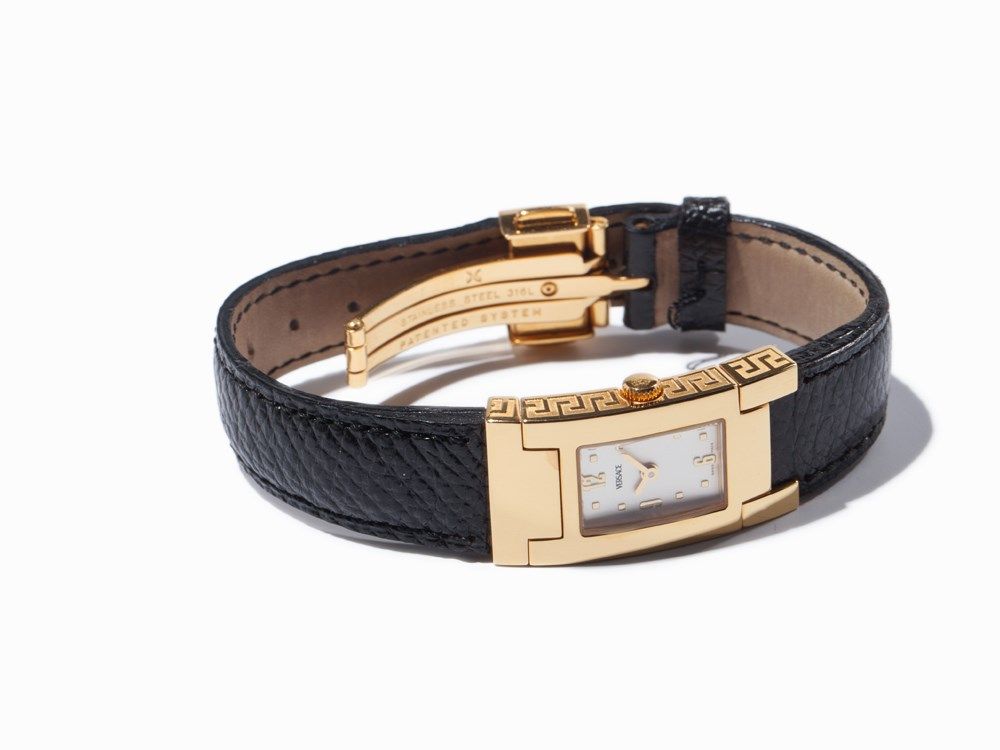 The present Versace watch was probably made ??around 1990 in Switzerland. It has a quartz movement, and displays the hour and minute. The white dial is fitted with gold numerals, hands and hour markers. The watch features the original, black leather strap with gold plated stainless steel clasp. The gilt stainless steel watch case is water resistant to 30 meters.