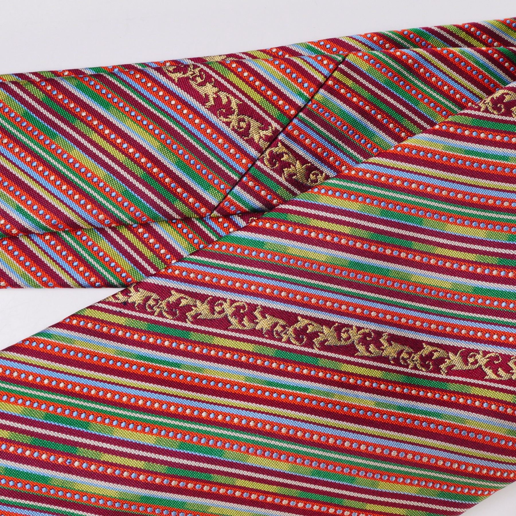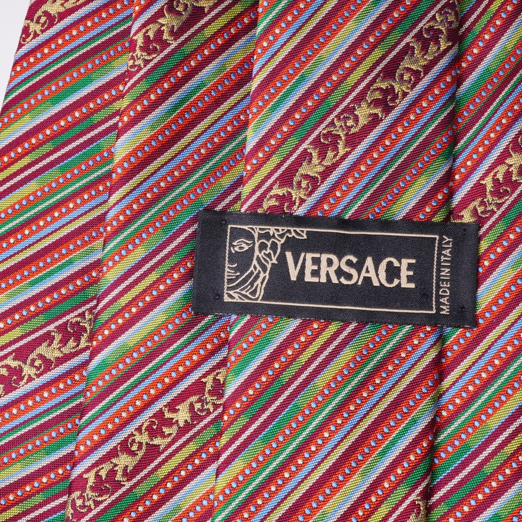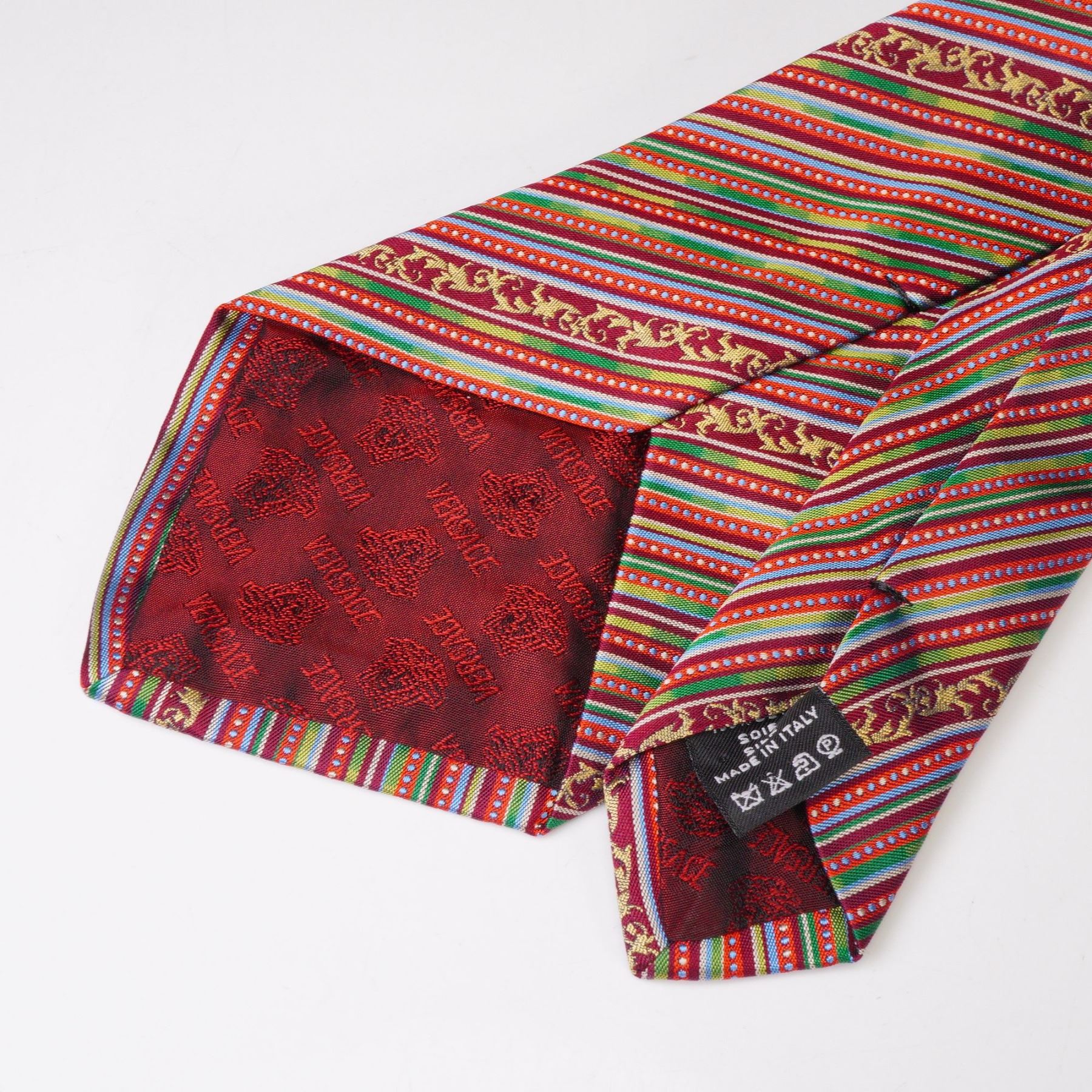 Versace silk tie made in Italy, featuring a bold diagonal stripe design in shades of red, gold, green, and blue with intricate woven baroque motifs. The interior lining bears the Versace Medusa logo in red jacquard.