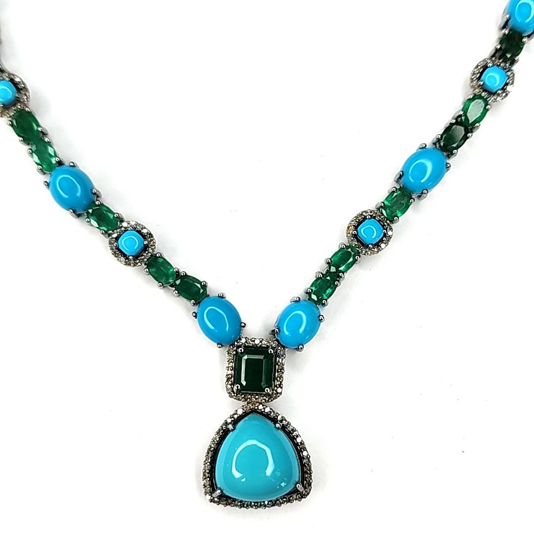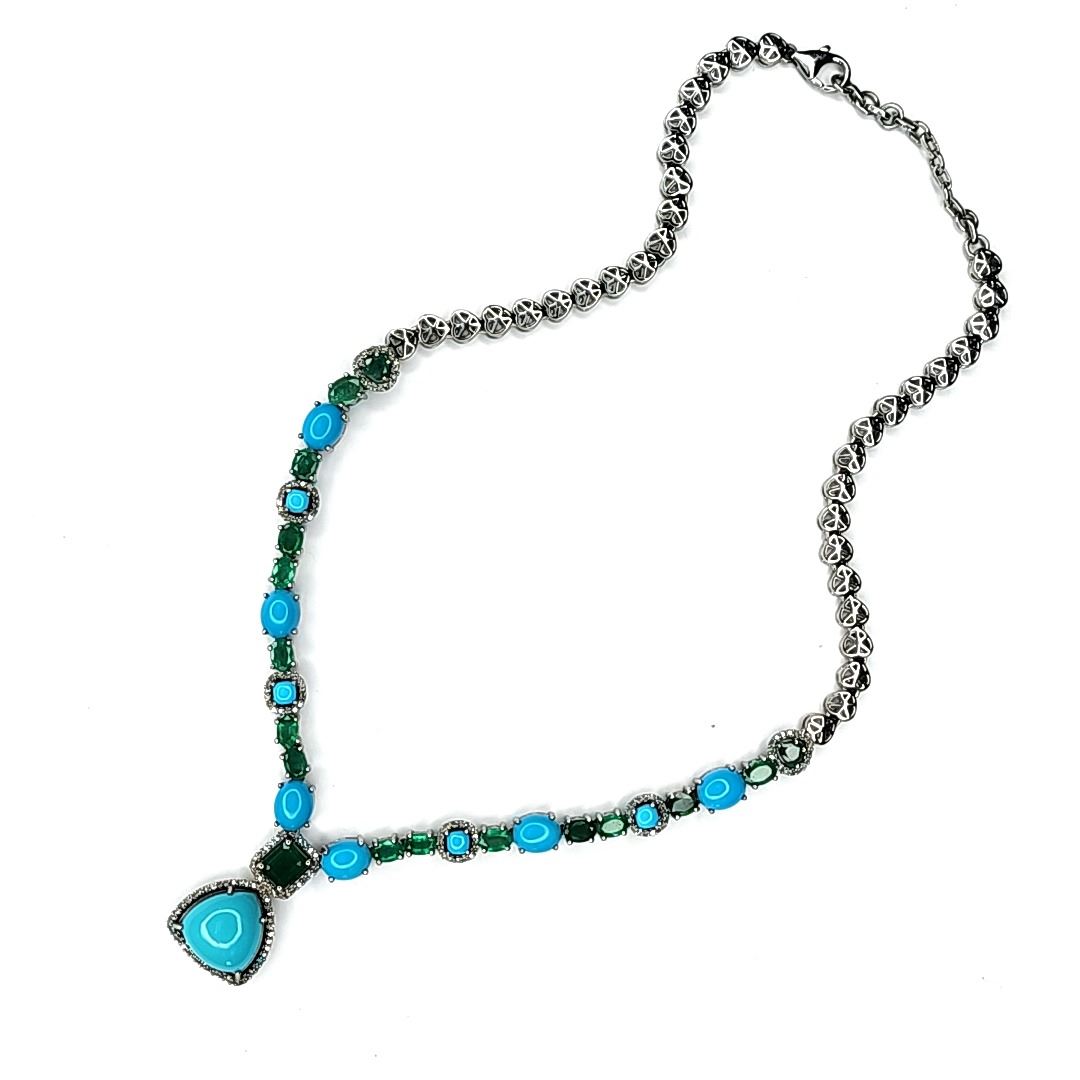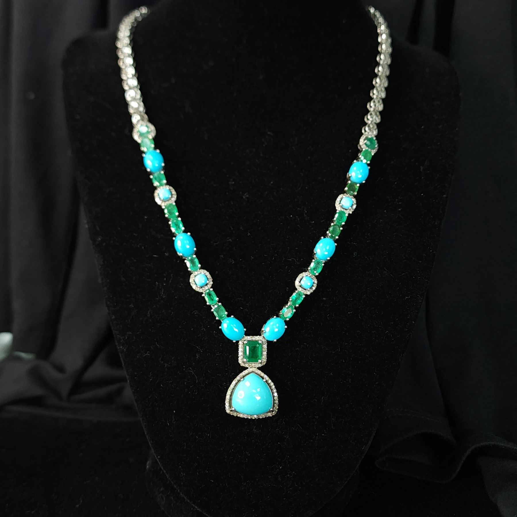 Genuine Turquoise, Genuine Emerald, and Earth-Mined Diamond Necklace.& nbsp; This necklace is so versatile, you can wear it to a rodeo or wear it to an & quot;invitation only& quot; gala! An approximate 14mmx14mmx6.5mm triangular-shaped cabochon turquoise that suspends from an approximate 1.00 carat emerald-cut emerald are the main focus of this drop-style necklace that has an additional 8.00 carats (approximate) of oval and round-cut emeralds and 10.00 carats (approximate) of oval and round cabochon turquoise along its bottom length. The 1.04 carats of round, faceted diamonds in the halos of the specially selected gemstones add just the right amount of dazzle.& nbsp; These beautiful gemstones are prong-set on a black rhodium-coated sterling silver (.925) chain made of heart-shaped, spoked links.& nbsp; The necklace is approximately 16& quot;& nbsp; long with a 2& quot; extension and a lobster clasp.& nbsp; The turquoise and emerald drop add an extra 1& quot; to the overall length.& nbsp; This is a brand new item in excellent condition.