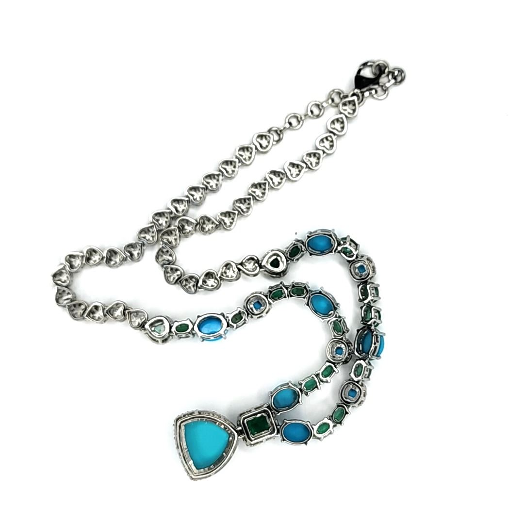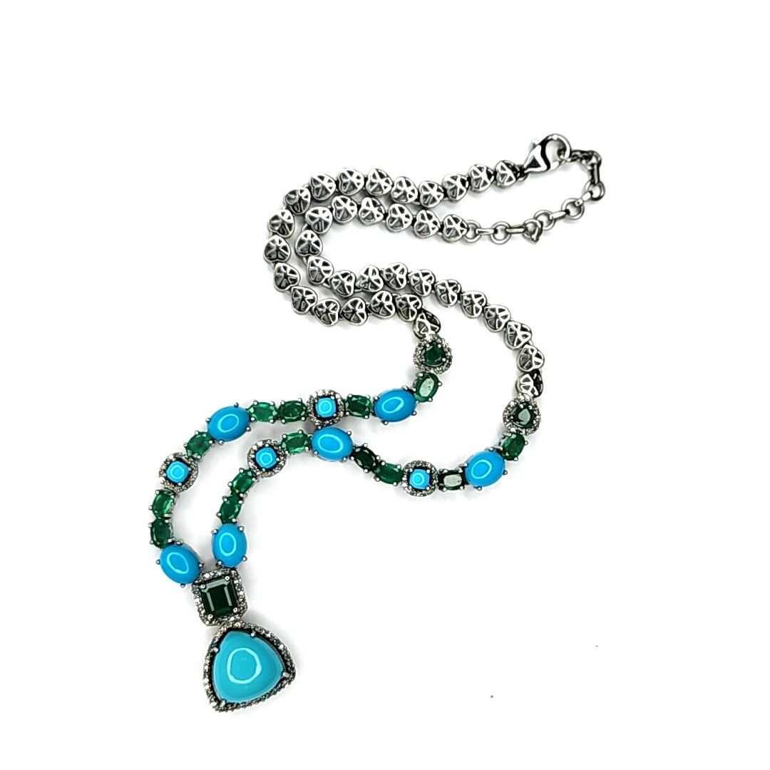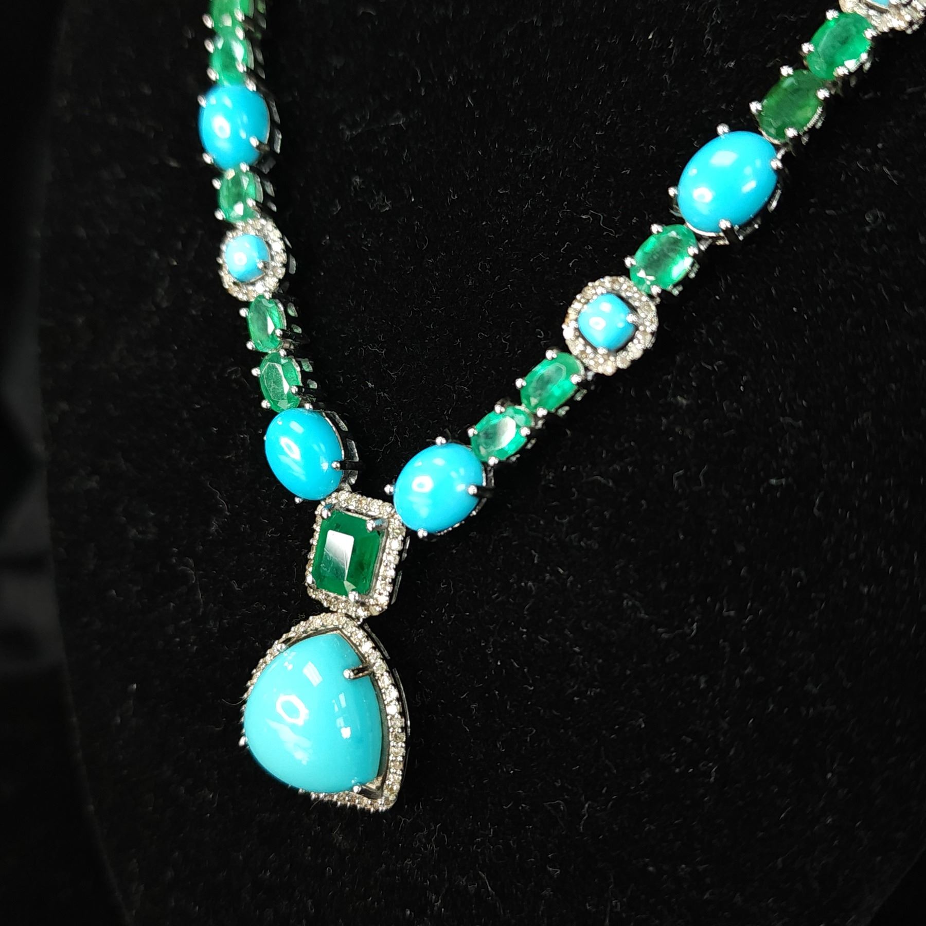 Genuine Turquoise, Genuine Emerald, and Earth-Mined Diamond Necklace.& nbsp; This necklace is so versatile, you can wear it to a rodeo or wear it to an & quot;invitation only& quot; gala! An approximate 14mmx14mmx6.5mm triangular-shaped cabochon turquoise that suspends from an approximate 1.00 carat emerald-cut emerald are the main focus of this drop-style necklace that has an additional 8.00 carats (approximate) of oval and round-cut emeralds and 10.00 carats (approximate) of oval and round cabochon turquoise along its bottom length. The 1.04 carats of round, faceted diamonds in the halos of the specially selected gemstones add just the right amount of dazzle.& nbsp; These beautiful gemstones are prong-set on a black rhodium-coated sterling silver (.925) chain made of heart-shaped, spoked links.& nbsp; The necklace is approximately 16& quot;& nbsp; long with a 2& quot; extension and a lobster clasp.& nbsp; The turquoise and emerald drop add an extra 1& quot; to the overall length.& nbsp; This is a brand new item in excellent condition.