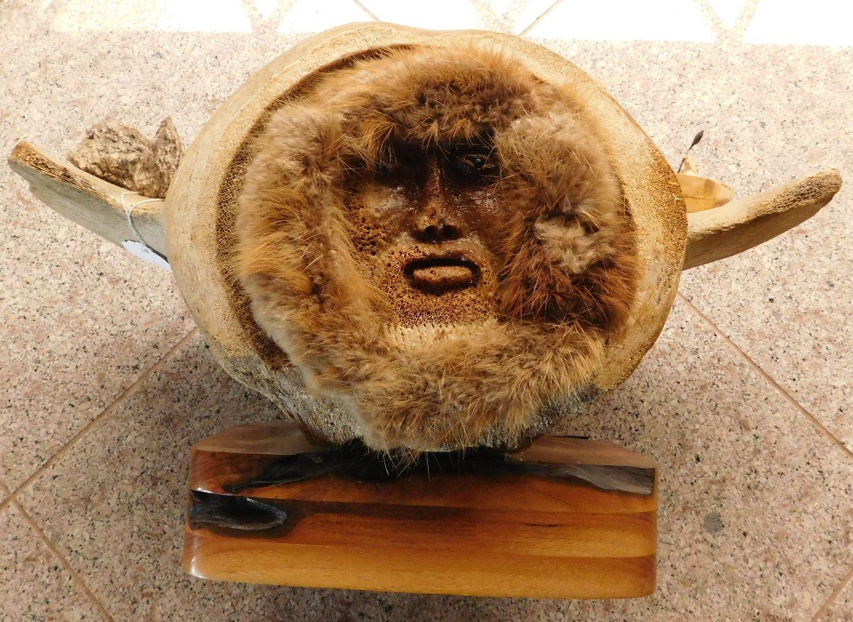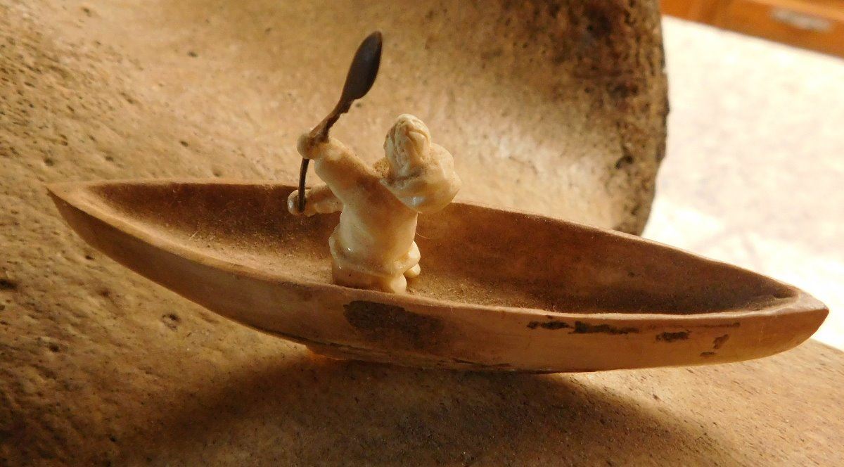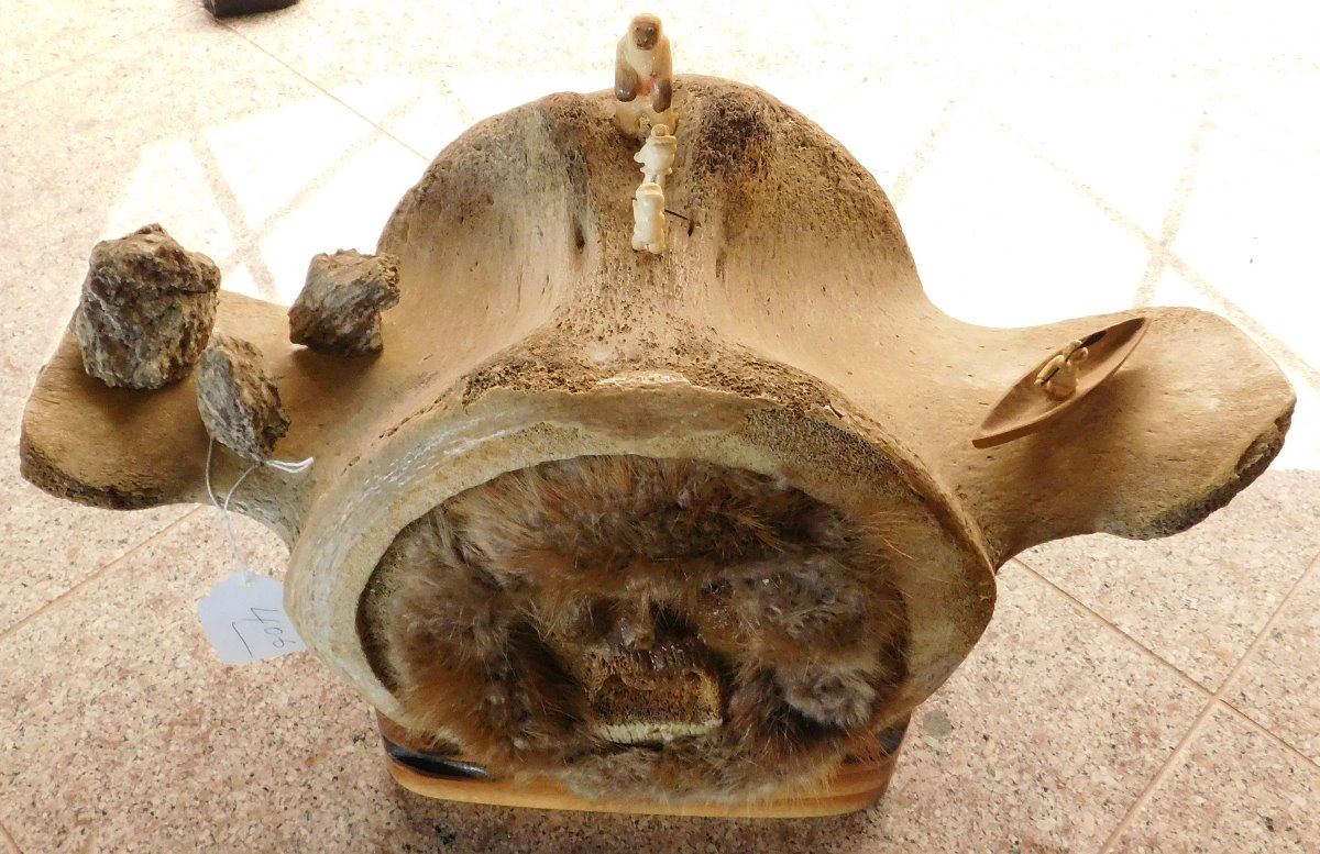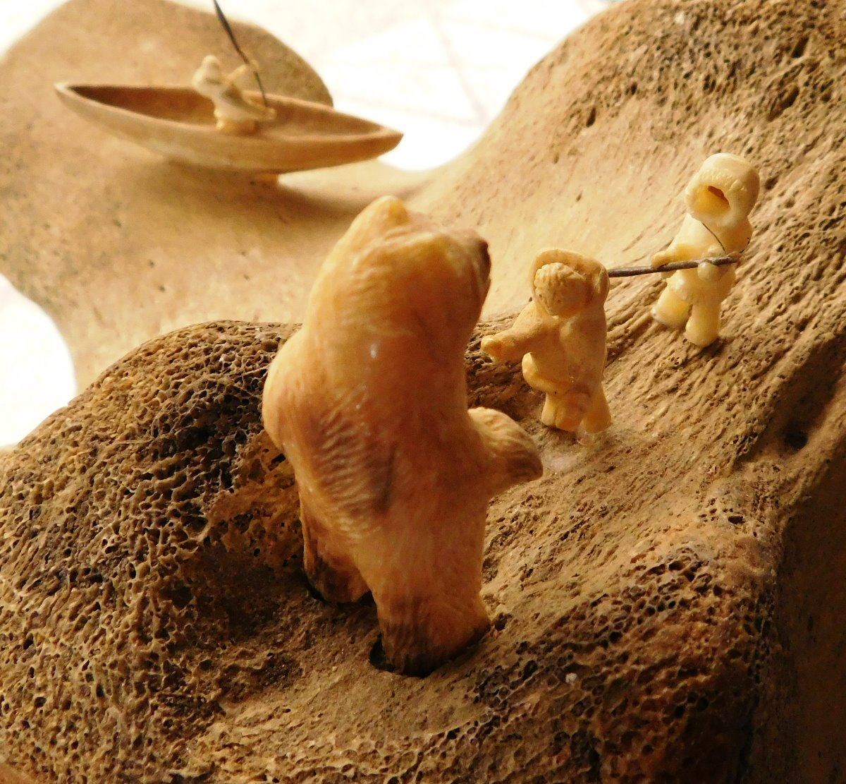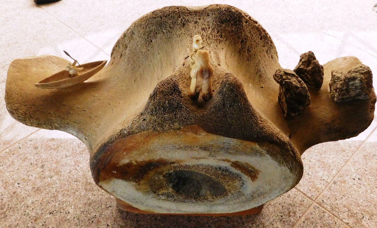 Vertebrae Sculpture, circa 1970s. Made of bone, rock and fur, the item is 19.5" x 10" x 13.5". Anchorage, Alaska. 3 carved figures and canoe. Condition: Very good, see images. Shipping: $55.00 USA estimate only, w/insurance and signature, due to size and weight.