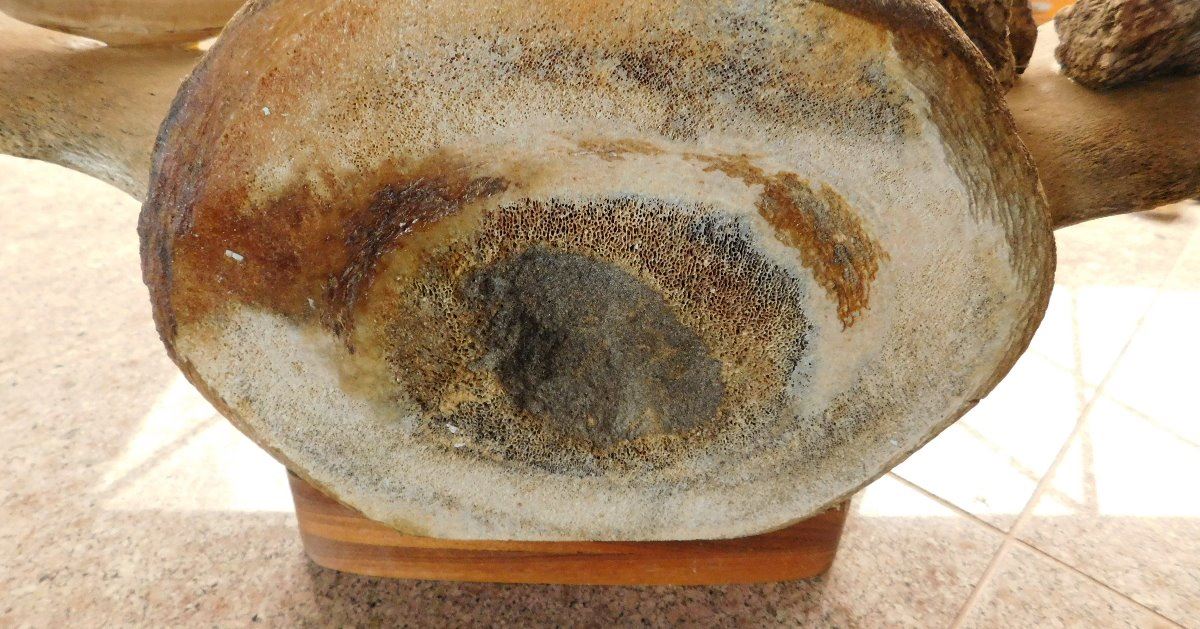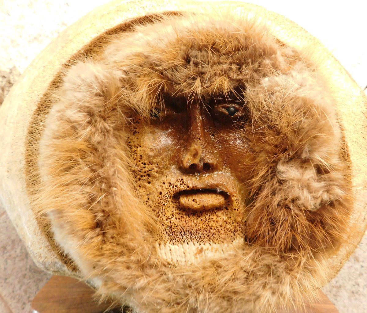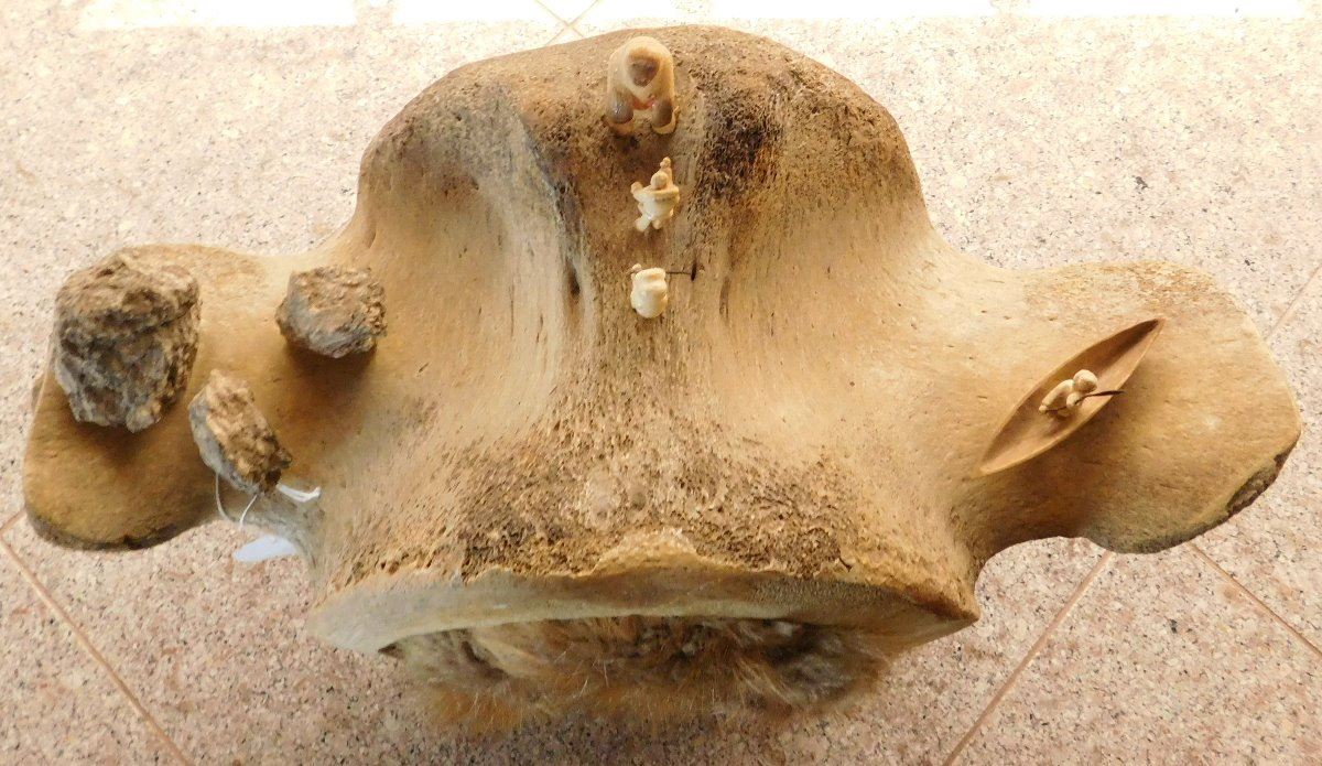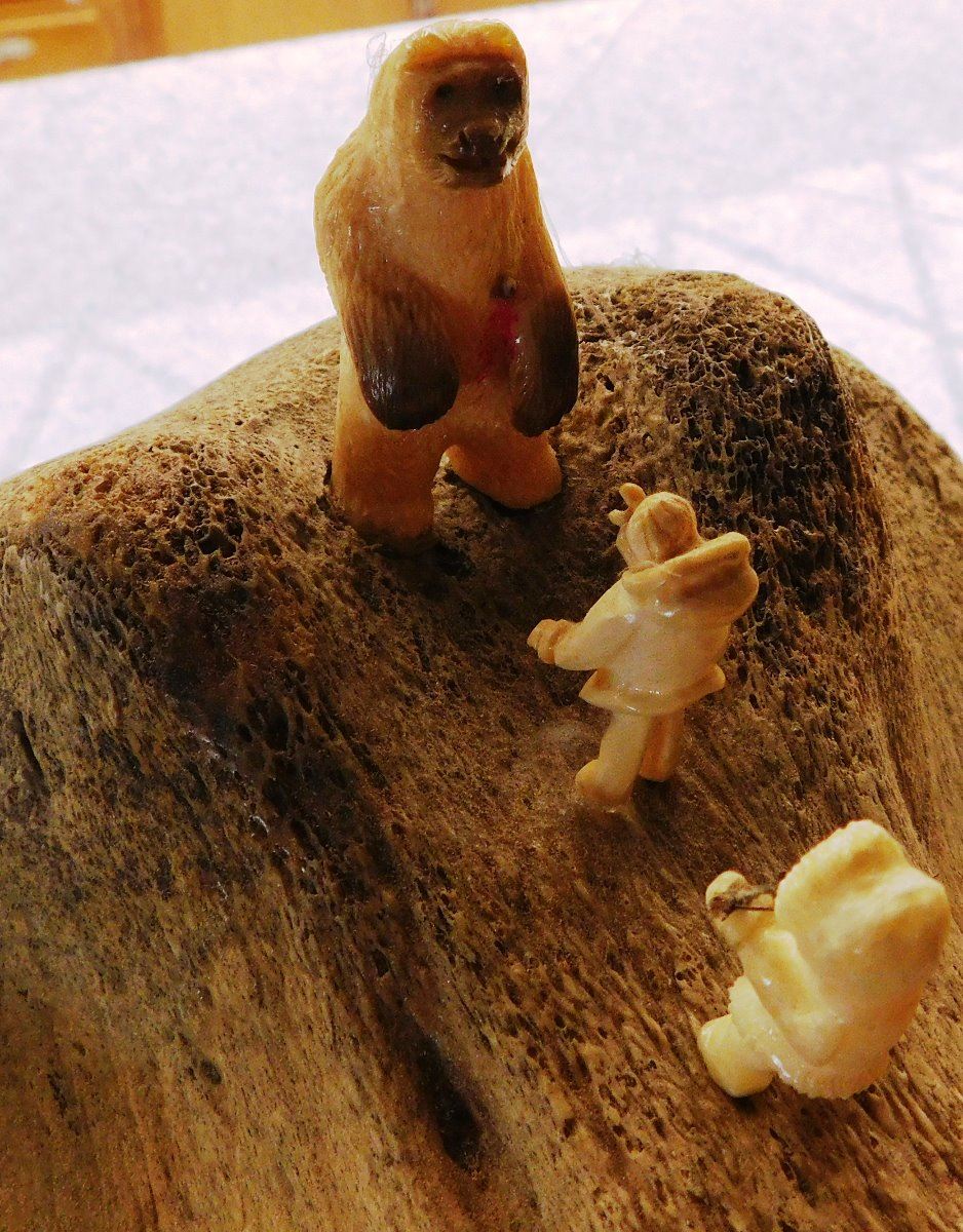 Vertebrae Sculpture, circa 1970s. Made of bone, rock and fur, the item is 19.5" x 10" x 13.5". Anchorage, Alaska. 3 carved figures and canoe. Condition: Very good, see images. Shipping: $55.00 USA estimate only, w/insurance and signature, due to size and weight.