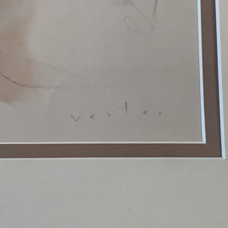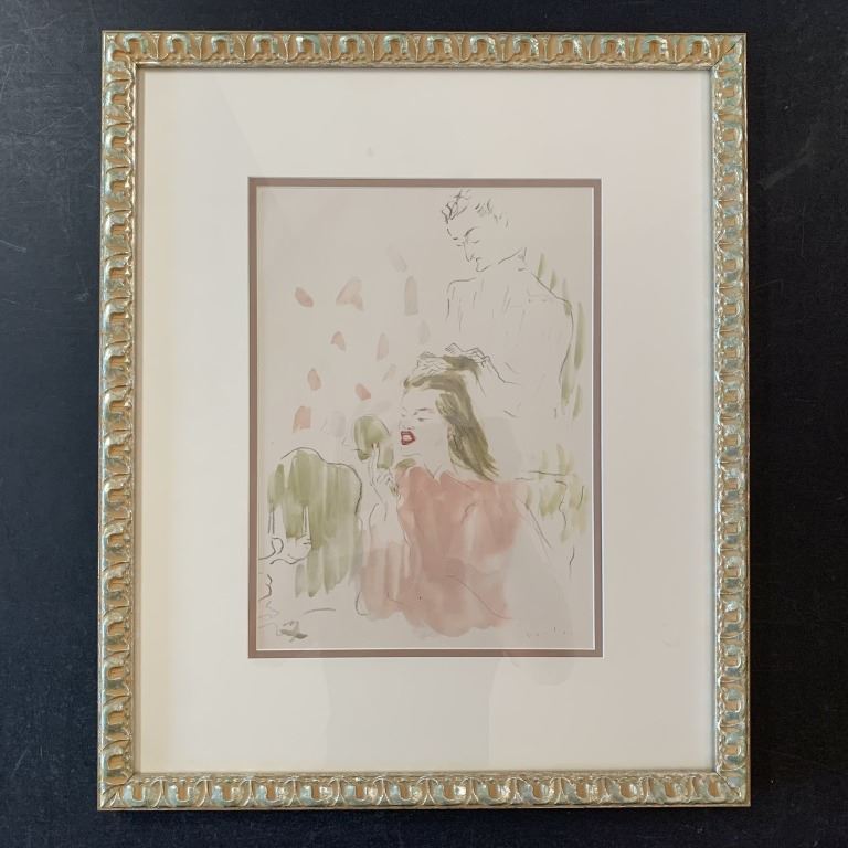 Vertes, Untitled, Framed Print on Paper. A woman checks her teeth for makeup while the hairstylist combs her hair. This piece is framed in off-white and pink matting and a gold, ornate frame. It is signed in the lower right and is in good condition.