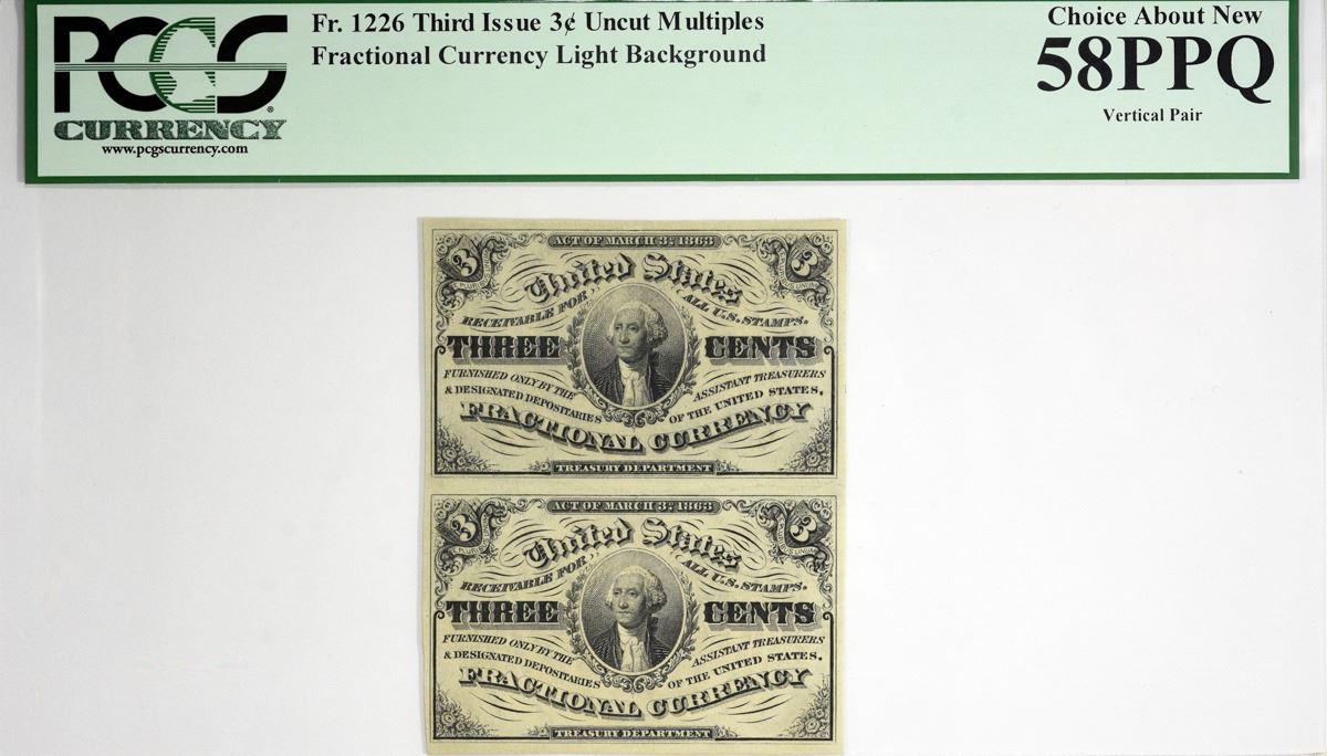Vertical Strip of (2) Fr. 1226. 3 Cent. Third Issue. PCGS Currency Choice About New 58 PPQ. Just a touch of circulation on this appealing pair of light background notes.