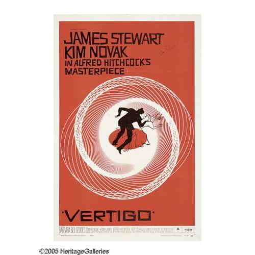 <B>Vertigo (Paramount, 1958).</B></I> One Sheet (27" X 41") Autographed. Now almost fifty years after its release, this Hitchcock thriller of darkness and obsession has remained one of the master director's most studied works. James Stewart and Kim Novak star in this story of a police detective's obsessive struggle with guilt, fear and desire. Famous graphic designer, Saul Bass, created the look of this trend-setting poster, which has the distinction of being signed by James Stewart in the upper right panel. It has pinholes in all four corners and several pinholes in the red image. There is also two small ink stains in the lower left panel within the outer edges of the white design. The colors are strong and the piece is unrestored in any way. Very Fine-.