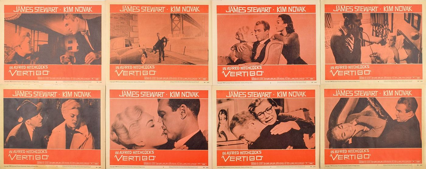 (Paramount, 1958) Complete set of eight original 14 x 11 lobby cards for Alfred Hitchcock's classic 1958 psychological thriller Vertigo, starring James Stewart and Kim Novak. The dramatic red-hued lobby cards feature stills from the iconic movie, which is remembered as one of the defining works of Hitchcock's prolific career in cinema. In overall fine condition, with old tape to reverse edges of lobby cards #1 and #4, and mild staining to the lower border of card #1.