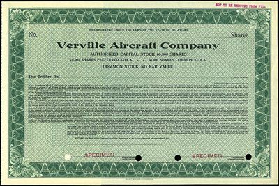 DE. 1927. Specimen. Alfred Victor Verville was born on November 19, 1890 in Atlantic Mine, Michigan. His career as an aircraft designer and builder spanned nearly fifty years, during which his genius and vision enabled him to influence the advancement of aviation during its formative years. Verville joined Curtiss Airplane Company in 1914, and he aided in the design of many Curtiss planes, including the first "Jenny" training plane, and the Curtiss F Flying Boat. In 1915 he organized the General Airplane Company of Detroit, producing the Verville Flying Boat and the Verville Twin Float Pusher. After WWI broke out, Verville joined the U.S. Army Service. In 1920 the young engineer gained national prominence when his Verville-Packard Racer won the first Pulitzer Speed Classic Trophy. After touring Europe with Gereral Billy Mitchell to assess the development of aviation there, Verville was asked by General Mitchell to design an airplane for the Air Service entry in the 1922 National Air Races. Verville designed the Verville-Sperry Racer. This plane was one of the first airplanes with retractable landing gear. Though it did not win the race, with some adjustments, it flew away with the 1924 Pulitzer Speed Trophy. The true importance of the Racer design was recognized in 1961, when it was selected as one of the twelve most significant aircraft of all time. In 1925 he organized the Buhl-Aircraft Company, producing the Buhl-Verville Airster. In 1927 he organized the Verville Aircraft Company, producing the Verville Coach, AT Trainer, and YPT-10. He served as engineer and consultant with Douglas, Curtiss Wright, and Snead aircraft companies, and Drexel Aviation, and he contributed 16 years of service to the Federal government, primarily with the Bureau of Aeronautics, before retiring in 1961. Alfred Verville has been honored with ten Certificates or Letters of Commendations from the U.S. Armed Forces. He was a Honorary Fellow of the Society of Experimental Test Pilots, and was named an Elder Statesman of Aviation in 1956. He held eight aeronautical patents. In 1985 a commemorative air amil postage stamp was issued in his honor. Historic and rare early aviation certificate. Born on November 16, 1890 in Atlantic Mine, Michigan. His career as an aircraft designer and builder spanned nearly fifty years, during which his genius and vision enabled him to influence the advancement of aviation during its formative years. SBNC. XF.