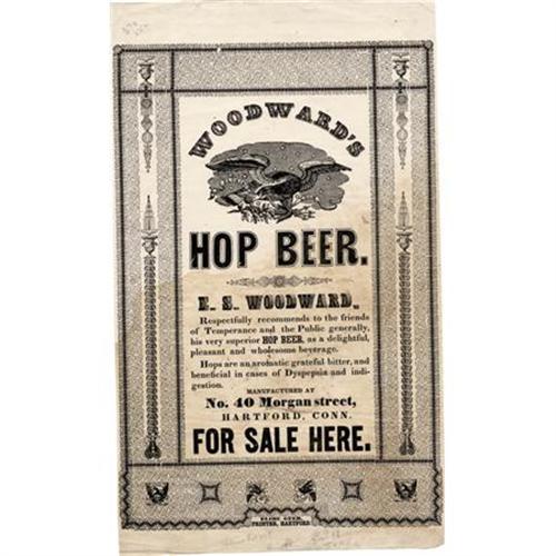 <B>Very Cool Victorian Beer Advertising Broadside,</B></I> one page, 8” x 13.75”, Hartford, Connecticut, circa mid-19th century. An engraved American eagle illustrates this sheet touting Woodward's Hops Beer. The manufacturer “<I>Respectfully recommends to the friends of Temperance and the Public generally, his very superior Hop Beer, as a delightful, pleasant and wholesome beverage.</B></I>” He further states that, “<I>Hops are an aromatic grateful bitter, and beneficial in cases of Dyspepsia and indigestion.</B></I>” Very convincing stuff. Light soiling, else very fine condition. <I>From the collection of Henry E. Luhrs.</B></I><BR><BR><b>Shipping:</b> Flat Material, Small (<a target="_blank" href="http://www.heritageauctions.com/common/shipping.php">view shipping information</a>)