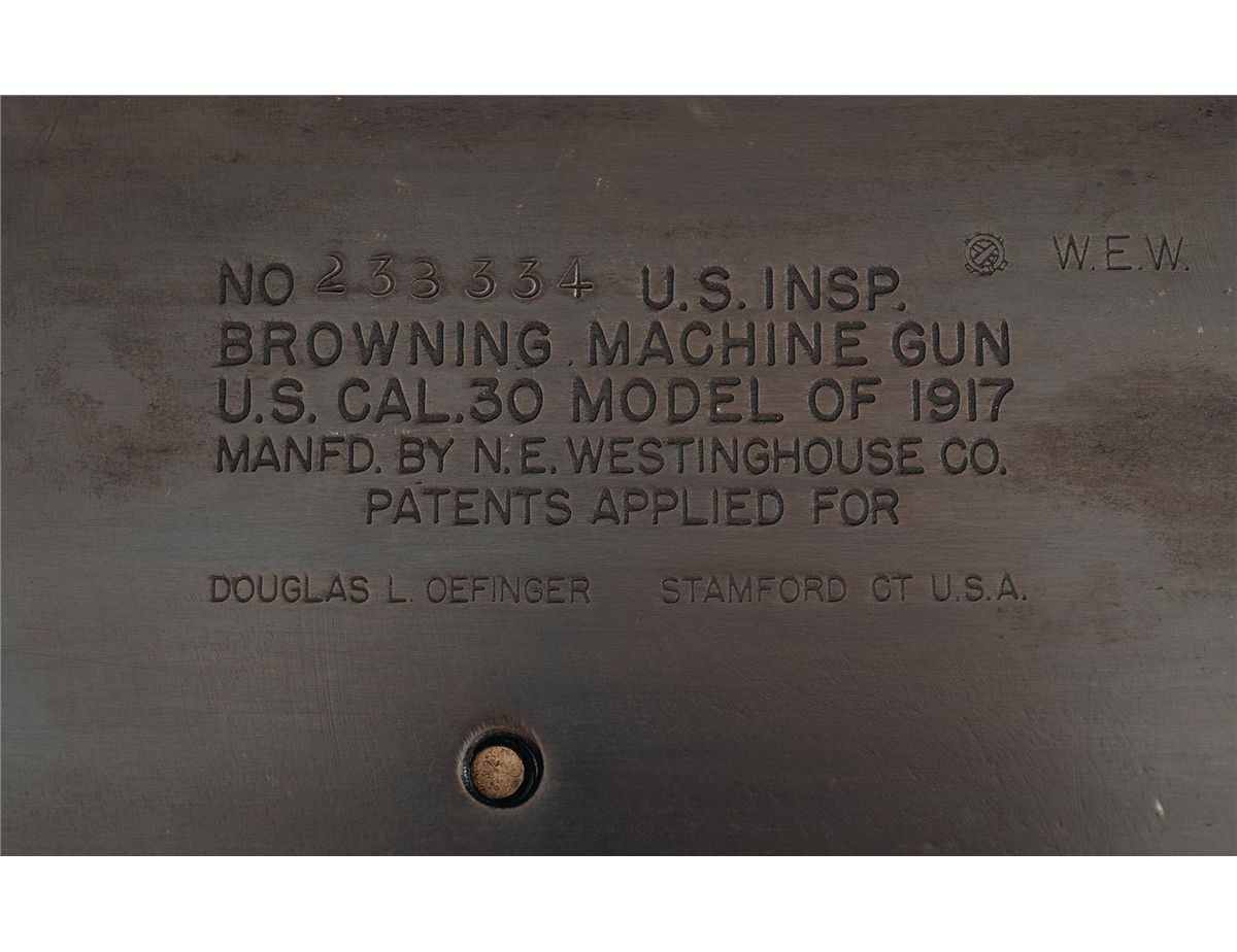 This is an excellent example of a very early remanufactured Browning Model 1917 Medium Machine Gun. These beautiful weapons were actually developed in late WWI and really saw most of their service in China and during the early days of WWII. Originally these were another of John Browning's wonderfully designed MGs that were all based on the riveted receiver machine, with his true legacy the M2 50cal still going strong after over 85 years. This specific weapon is very unique in that it is one of the water cooled version that had the large water jacket around the barrel, similar to the Maxim MGs. This example was manufactured using an original parts set mated to a new manufactured "DLO" side plate, that has been photo etched with the original markings. The DLO company actually stands for Doug L. Oefinger, a class 2/3 manufacturer and dealer in Florida, who actually challenged the U.S. Government on the Constitutional merits of the Hughes Amendment to the 1986 Firearm Owner's Protection Act. Prior to that date he was well know in the industry as providing some of the best and most authentic machine guns and new receiver side plates and tubes. This is an early model that has his full named engraved on the side plate along with the photo-engraved/milled markings of "NO. 238334 U.S. INSP./BROWNING MACHINE GUN/U.S.CAL 30 MODEL 1917/MANFD BY N.E. WESTINGHOUSE CO.". This excellent example is complete with an original brass water jacket, a 1917 cradle with the pintle and T&E mechanism attached, a U.S 1917 tripod, a water can and one rubber water hose.