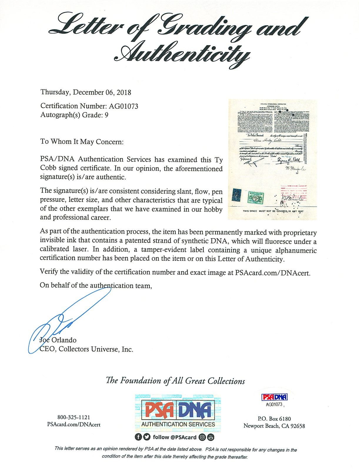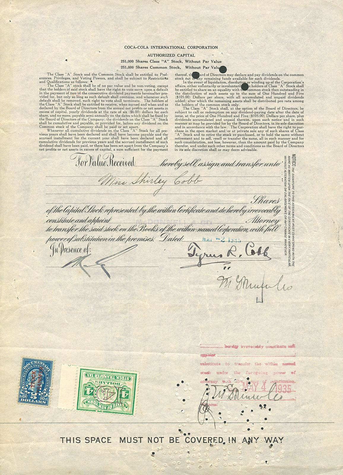 Partly-printed contract, signed “Tyrus R. Cobb,” one page both sides, 11.75 x 8.5, December 31, 1930. Stock certificate for 100 shares in the Coca-Cola International Corporation issued to "Tyrus R. Cobb," endorsed on the reverse by Cobb to transfer and assign the shares to his eldest daughter, "Miss Shirley Cobb." In fine condition. This is how Ty Cobb made his fortune, which rumor was he used to carry around in paper bags. He bought Coca-Cola stock when it was dirt cheap. Born in 1911, Cobb's daughter Shirley would go on to open an independent bookstore in Palo Alto, California, and volunteer overseas with the Red Cross during World War II; in 1946, she was awarded the highest military award a civilian can receive, the Medal of Freedom, for her 'high standards of moral conduct and devotion to duty...in elevating the morale of the troops' in France and Italy. An interesting document combining America's national pastime with its favorite drink.