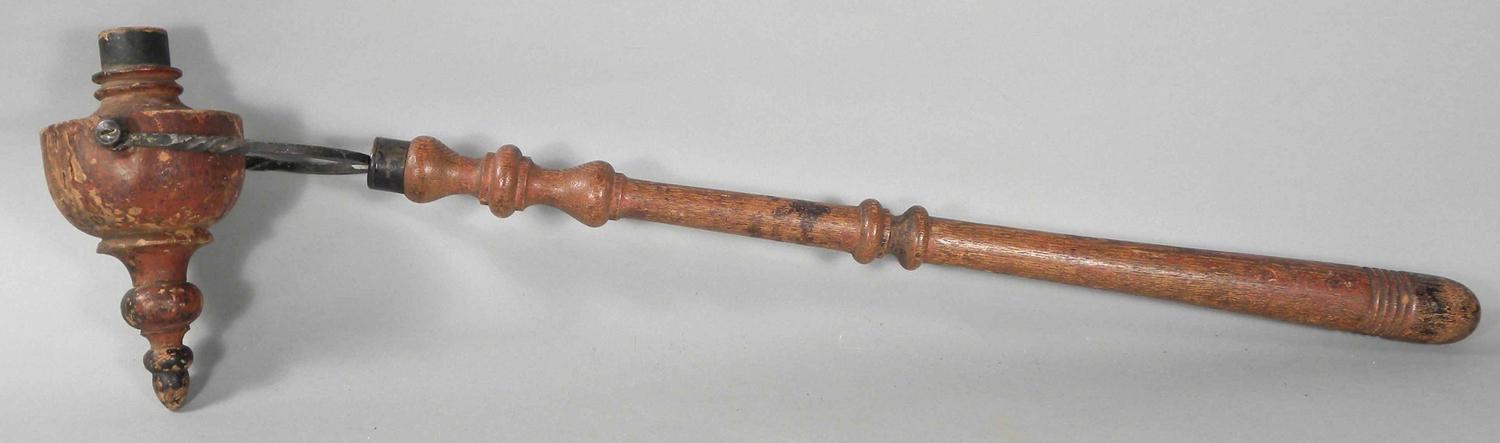 Very Early 1800's Firemen's Parade Torch. Forged iron bracket with wood reservoir and handle. Good original condition. 31 1/2 inches long.