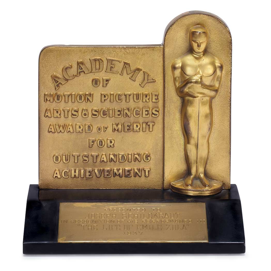 Bronze tablet Oscar awarded to Joseph Schildkraut for Best Supporting Actor in ''The Life of Emile Zola'' directed by William Dieterle. The film also took home the Best Picture and Best Screenplay awards during the 10th Academy Awards held 10 March 1938 at the Biltmore Hotel in Los Angeles. Born in Austria, Schildkraut moved to America in the early 1900's to become a Broadway performer, silent film actor and finally, a prominent film star in the Golden Age of Hollywood. His role as Captain Alfred Dreyfus in ''The Life of Emile Zola'' became seminal to his career and his Oscar win here marked the first time a Jewish actor was awarded an Oscar. Dreyfus, the infamous French Jewish artillery officer falsely accused and convicted of treason in 1894, polarized the country in what became known as the Dreyfus Affair; writer Emile Zola put his life on the line in his famous public newspaper outcry ''J'Accuse'' to help the eventual pardon of Dreyfus, as the film depicts. Symbolically, Schildkraut's 1937 Academy Award represents not only the second issued Best Supporting Actor award in Oscar history but also the second Oscar awarded to a Jewish actor. Issued during the period when the traditional Oscar statue was only given to actors in leading roles, this bronze tablet-style award features the Oscar figure in relief. Beside it, the words ''Academy / of / Motion Picture / Arts & Sciences / Award of Merit / for / Outstanding / Achievement'' appear. Mounted to a black marble base. A plaque on the front of the base is engraved: ''Presented to Joseph Schildkraut / In Recognition of His Performance in / 'The Life of Emile Zola' / 1937''. Award measures 6.25'' in total height, 5.75'' across, and base measures 3.25'' deep. The presentation plate re-affixed to base has some glue residue, surface wear and one very small indentation to rear edge of tablet. Stamped on the verso ''Dodge Inc. L.A.'', the company who manufactured the awards at that time. Very good to near fine condition. Obtained from the Joseph Schildkraut estate.