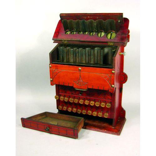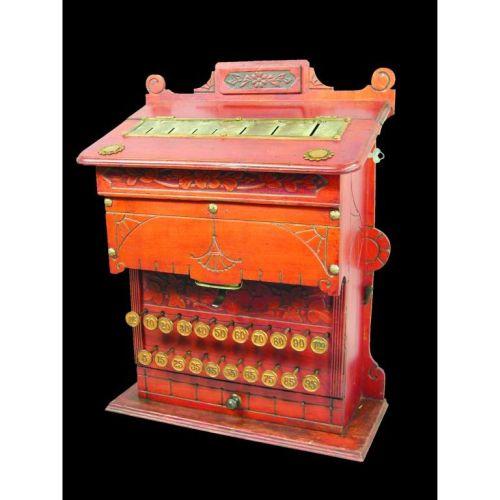 Very Early Coin Drop Register. Cherry Wood. Comes with key. Excellent original condition. 14 1/2 x 19 x 6 1/4 inches.