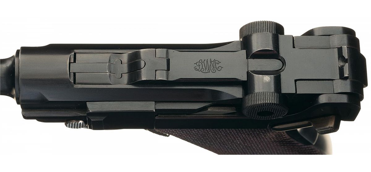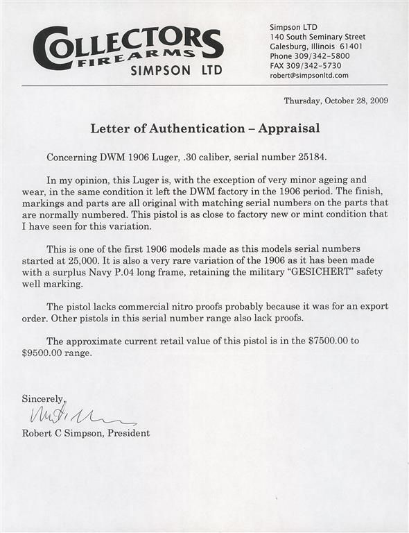This is an example of a very early production Model 1906 Commercial Luger intended for sale outside of Germany or Europe. This early example has been manufactured with the early 1904 Navy style long-frame with early "GESICHERT" marking in the lower area. This is a really rare version as most of these early 1906 commercials had the short frame. It has the correct blank chamber with the "DWM" logo on the front toggle, with no visible DWM factory proof or acceptance marks. It is numbered in the correct commercial fashion with the full serial number (25184) on the front of the frame and underside of the barrel, with the last two digits of the serial number "26" on the various smaller parts. It is complete with an early unmarked commercial magazine with the nickel plated magazine body and unmarked wooden base.