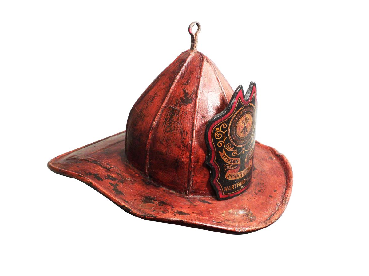Fire Helmet Trade Sign for the Hartford, Conn. Veterans Firemen's Assn. Painted wood, barrel type construction. Very good condition. 27 X 20 X 20 inches.