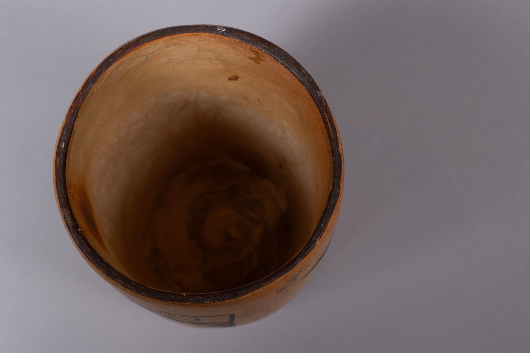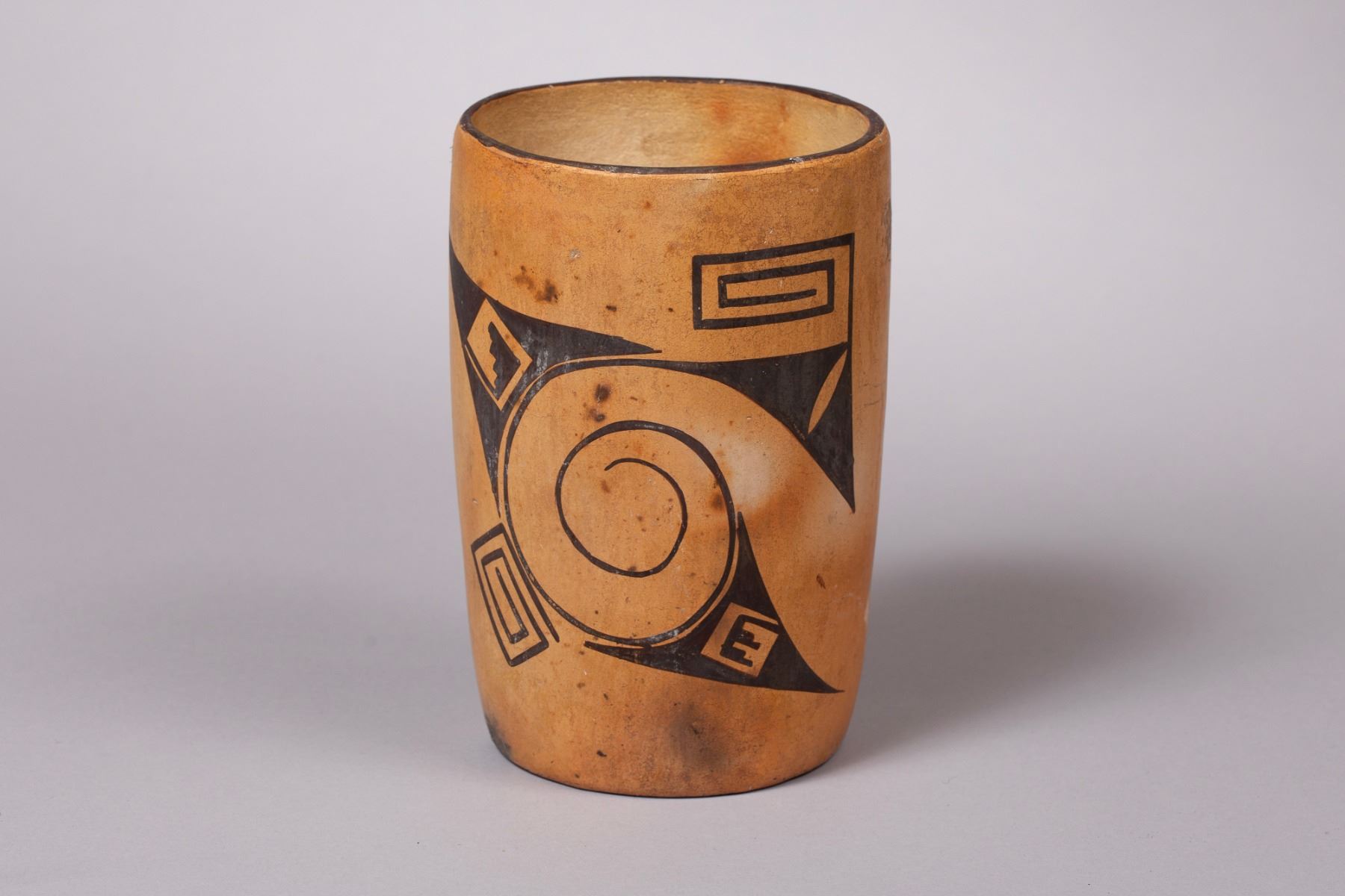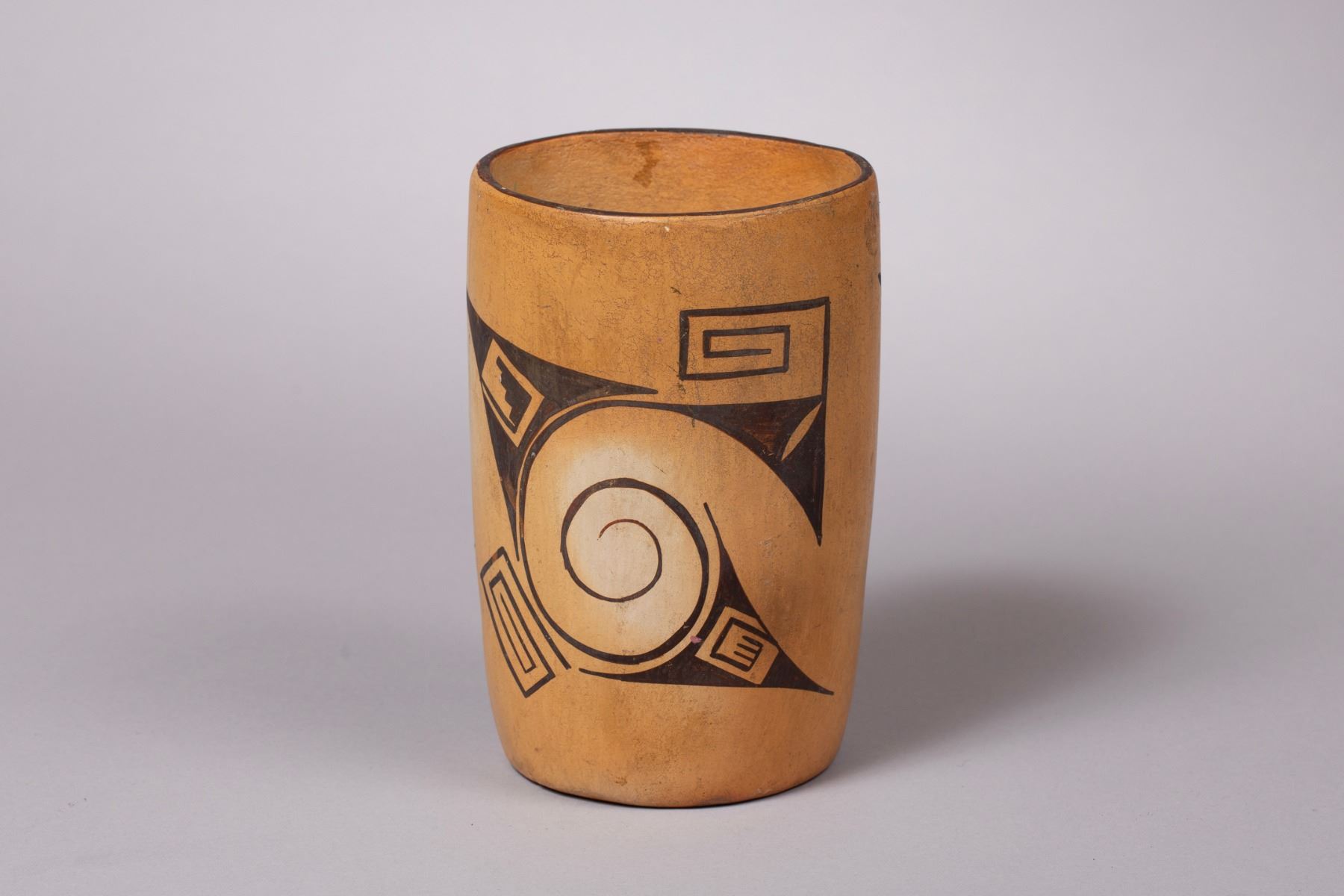 This elegant and finely crafted Hopi redware cylinder vase is a striking example of the Sikyatki Revival pottery movement. The revival was pioneered by famed potter Nampeyo (c. 1859–1942) and other artisans who looked to designs from the prehistoric Sikyatki village for inspiration in the late 19th and early 20th centuries.