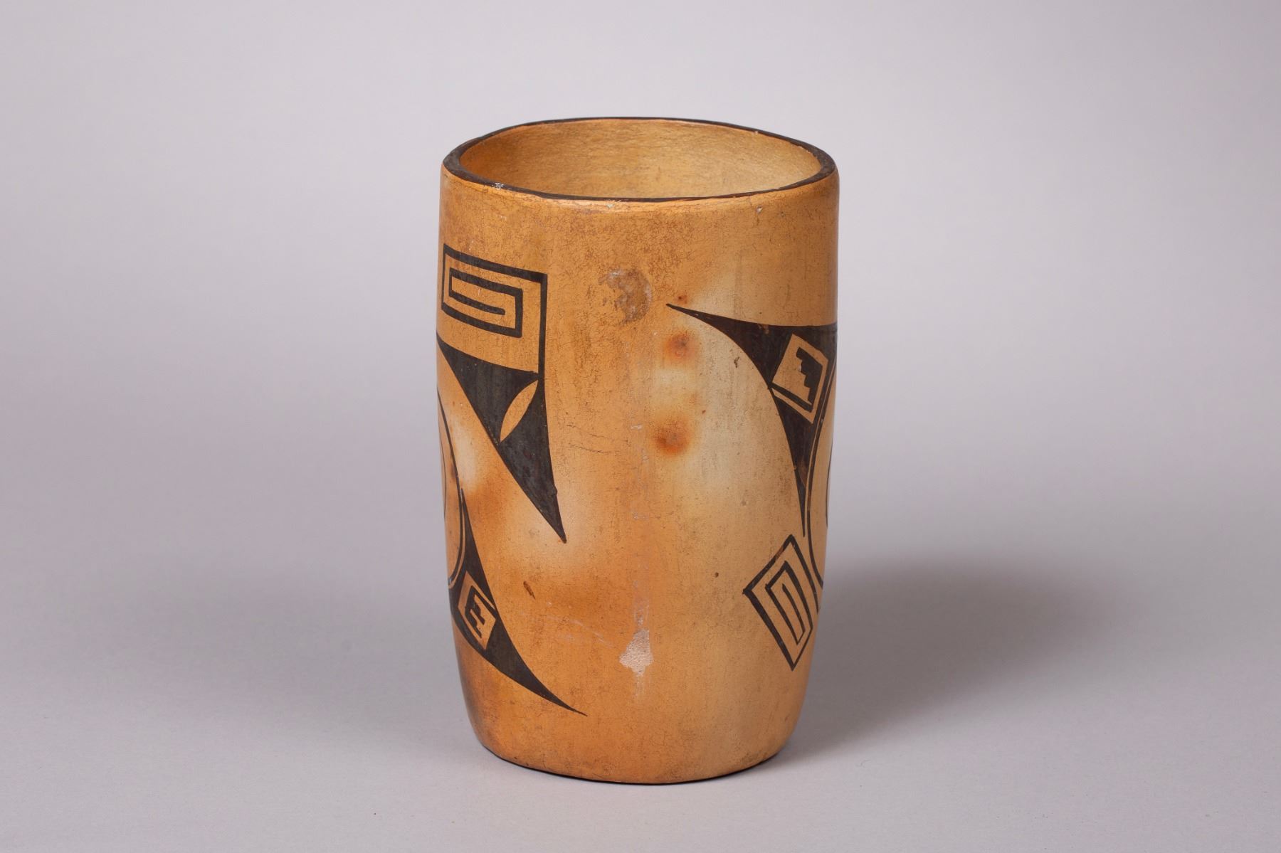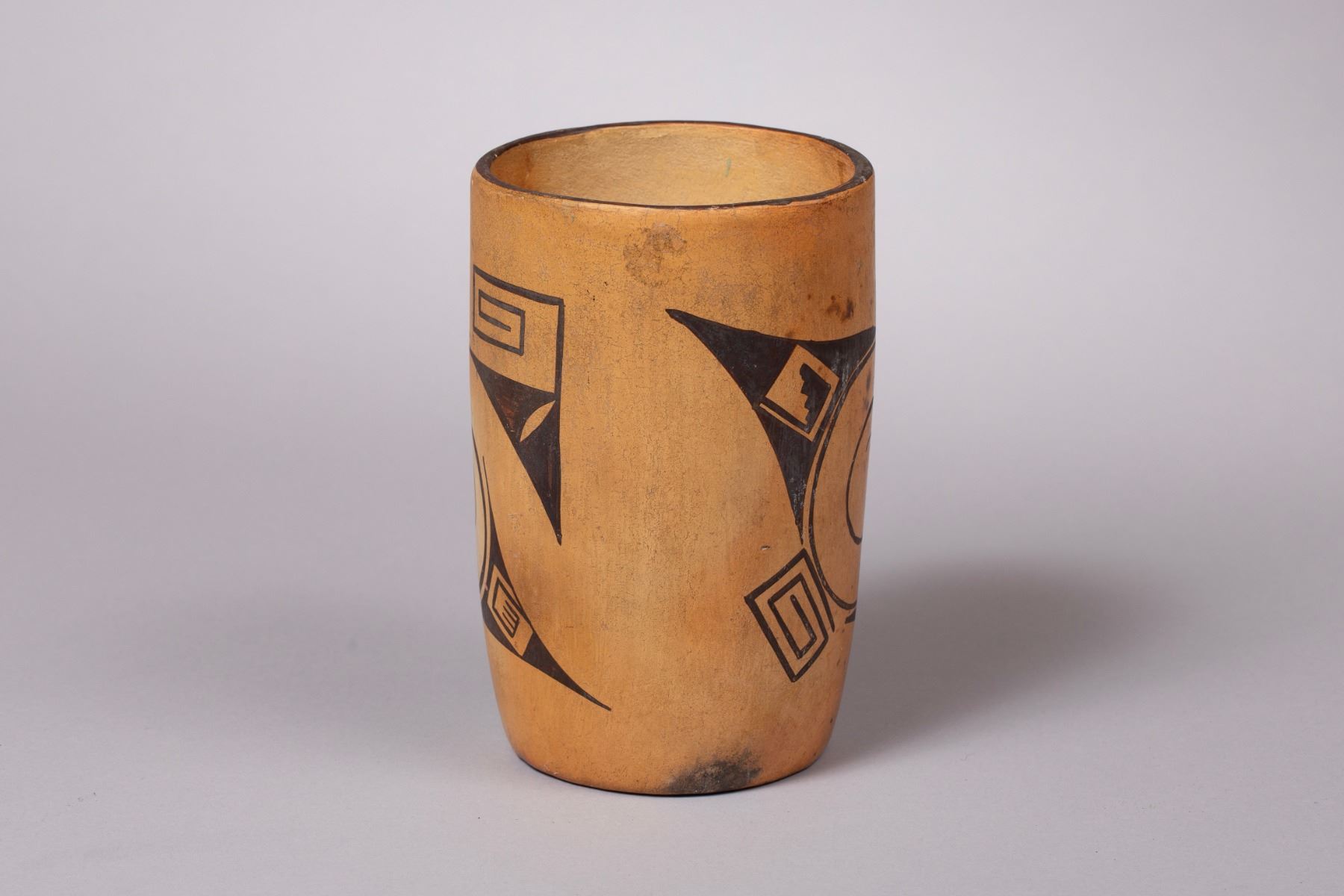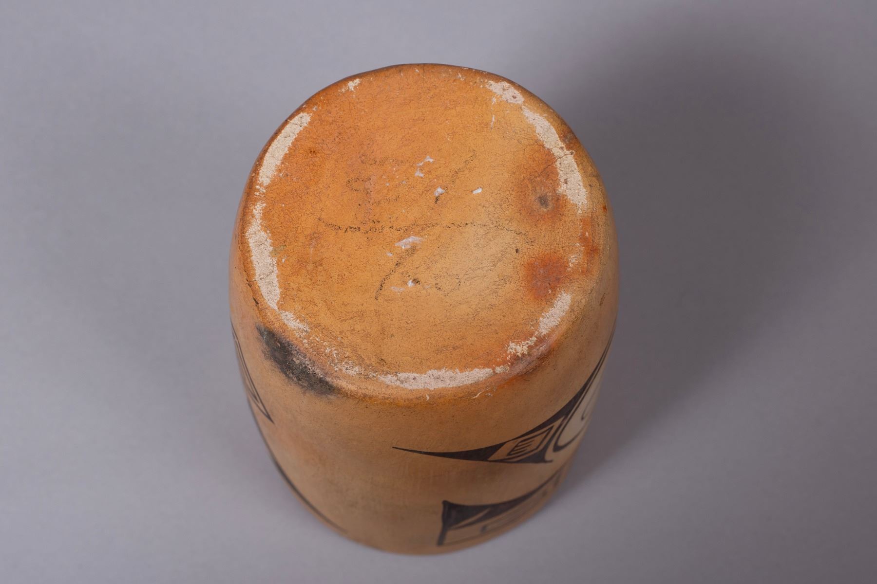 The cylindrical form, while not a traditional prehistoric Hopi shape, was a popular revival style. The vessel's surface features a burnished red slip, over which bold black and white designs have been painted. The stylized linear and curvilinear patterns depicting abstract elements, which are characteristic of the Sikyatki style. This piece showcases a masterful control of line and composition, with the design harmoniously wrapping around the form.