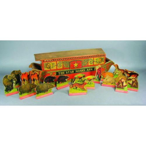 Very Early Paper Litho and Wood Noahs Ark and Animals Toy. Very Rare to find in this condition with bright colors. Cardboard bottom has separated otherwise excellent original condition. 22 X 8 X 5 inches.
