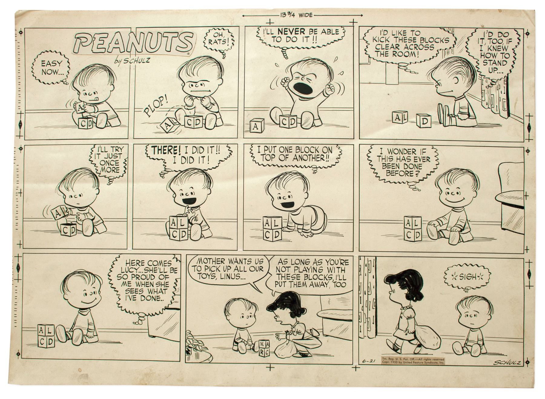 One of the earliest ''Peanuts'' Sunday strips, hand-drawn by Charles Schulz and published 21 June 1953. The first Sunday strip debuted in January 1952 after the strip's daily debut in 2 October 1950. In this strip, Linus is barely a toddler, and goes from frustration to pride to sadness in the course of 11 panels, eloquently visualizing childhood development. Measures 23.75'' x 17''. United Feature Syndicate label appears on last panel. Bends to top corners and light soiling, mostly along margins. Overall a bright strip, in very good plus condition.