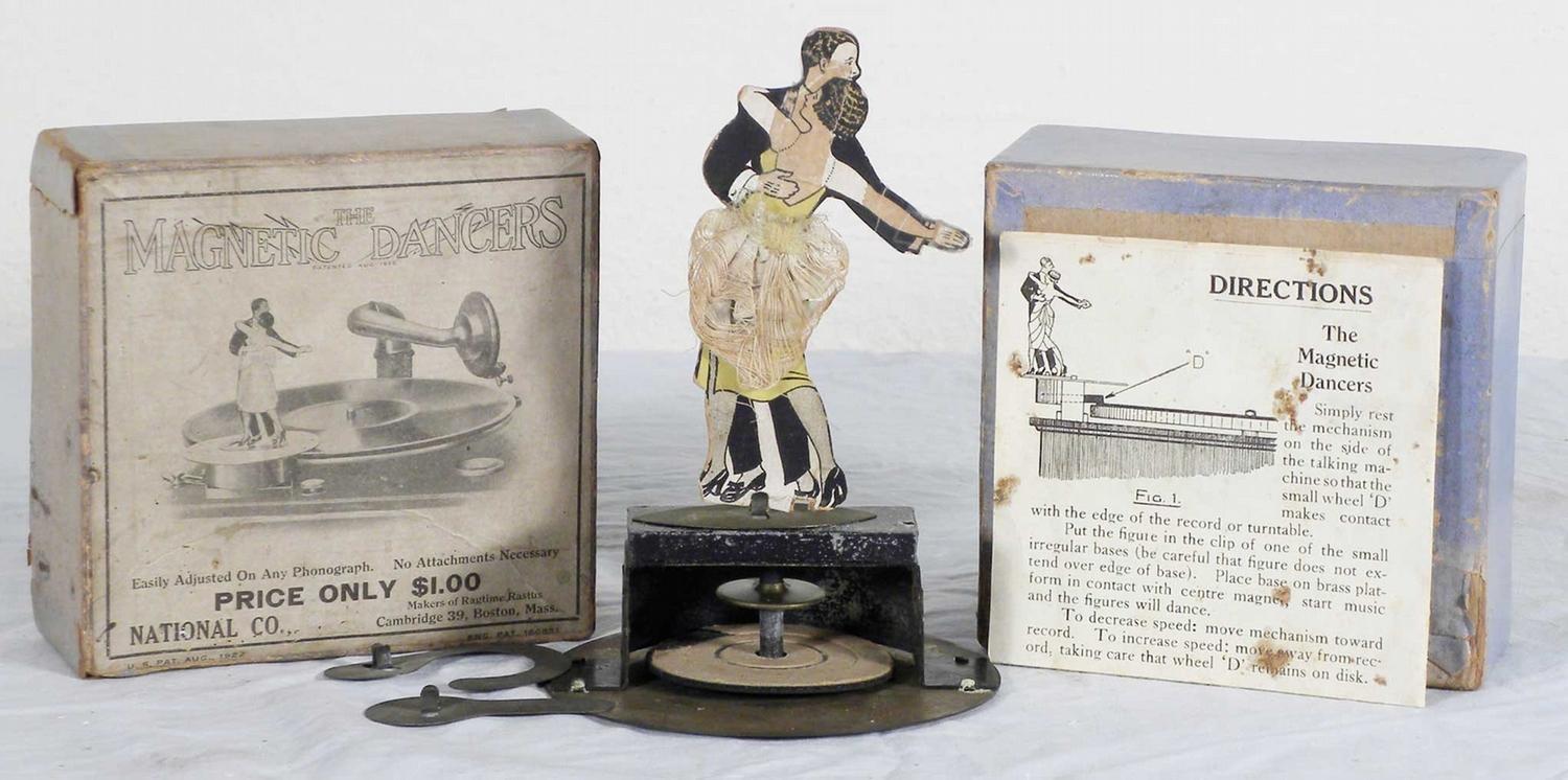 Very Early Phonograph Dancers, ca. 1920. "The Magnetic Dancers" also known as the "TangoTwo", easily adjusted on any phonograph. Makers of Ragtime Rastus, National Co. Cambridge, Mass. They come in the original box with instructions. Fair condition. Box measures 4 1/4 inches square X 1 3/8 inch deep.