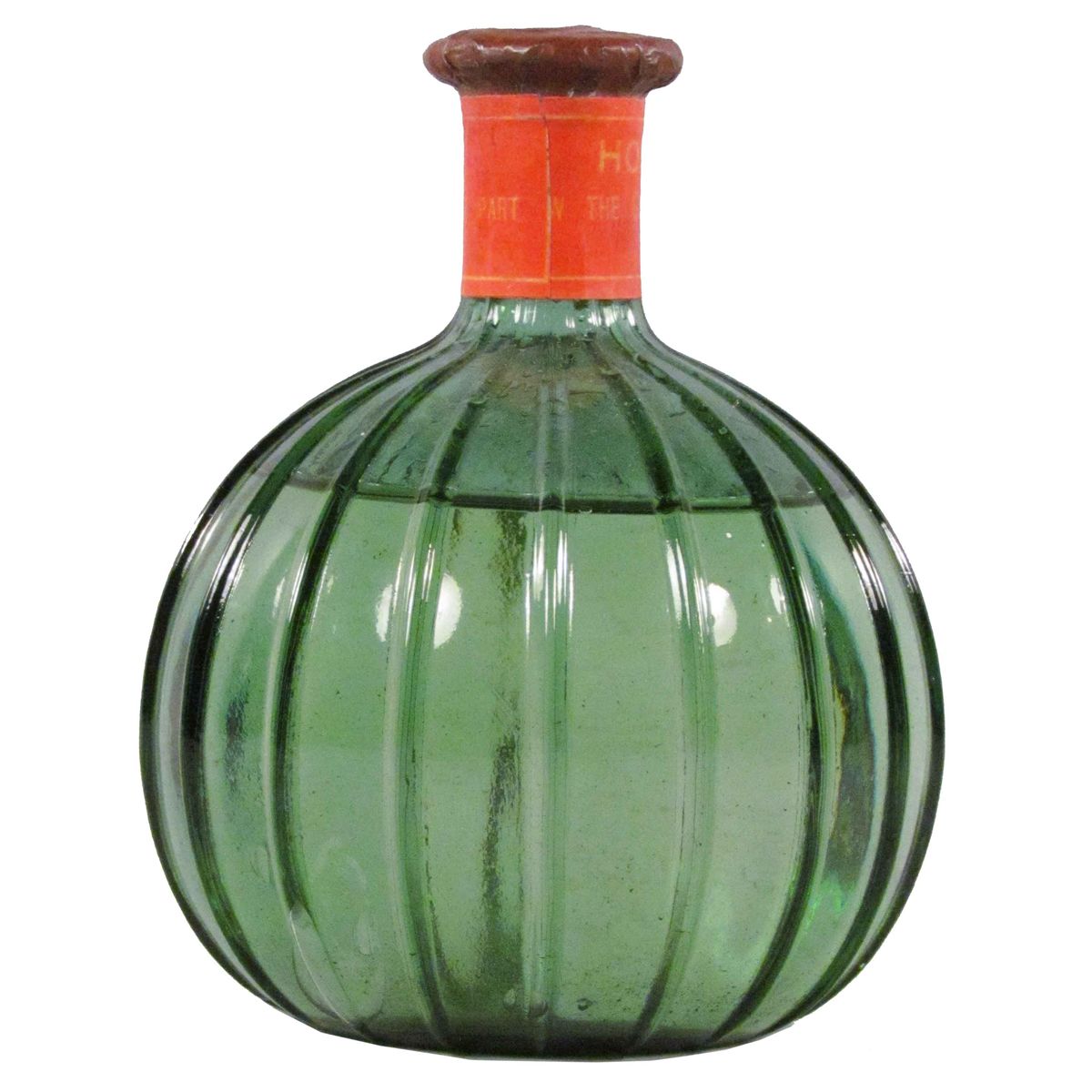 Unembossed Fire Grenade probably one of the oldest. Globular and vertical ribbing all around. Original seal, full without chips or cracks. 5 1/2 inches tall.
