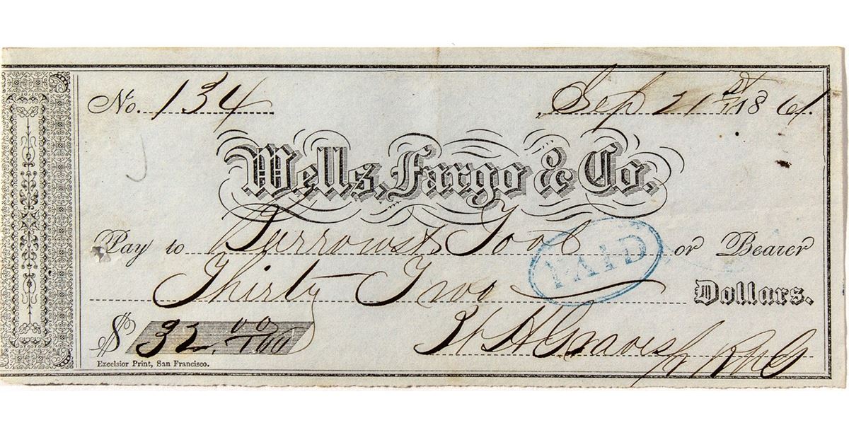 Purple/blue. Wells, Fargo & Co. Sept. 21st, 1861. Signed by R.N. Graves, who was superintendent of the Gould & Curry mine, Empire Mine and Milling Co. and the Imperial Mining Co. Nevada Territory had only been created six months prior. Statehood was 3 years away. Pinhole and light soiling. Stamped Paid. (Prag Collection)