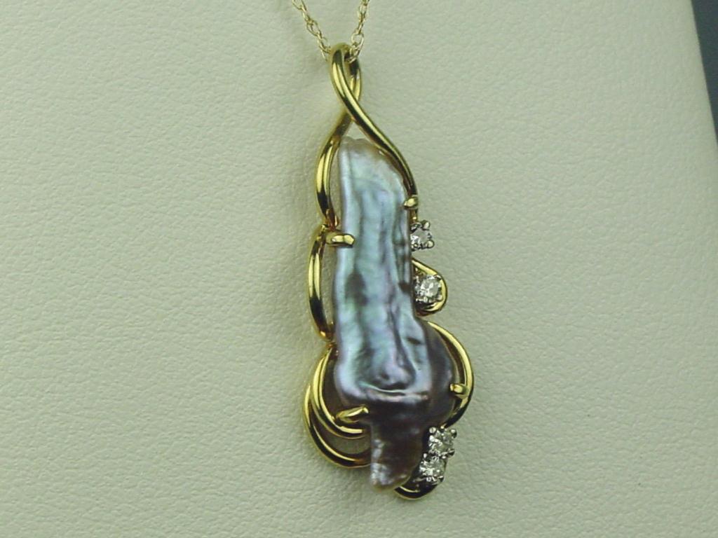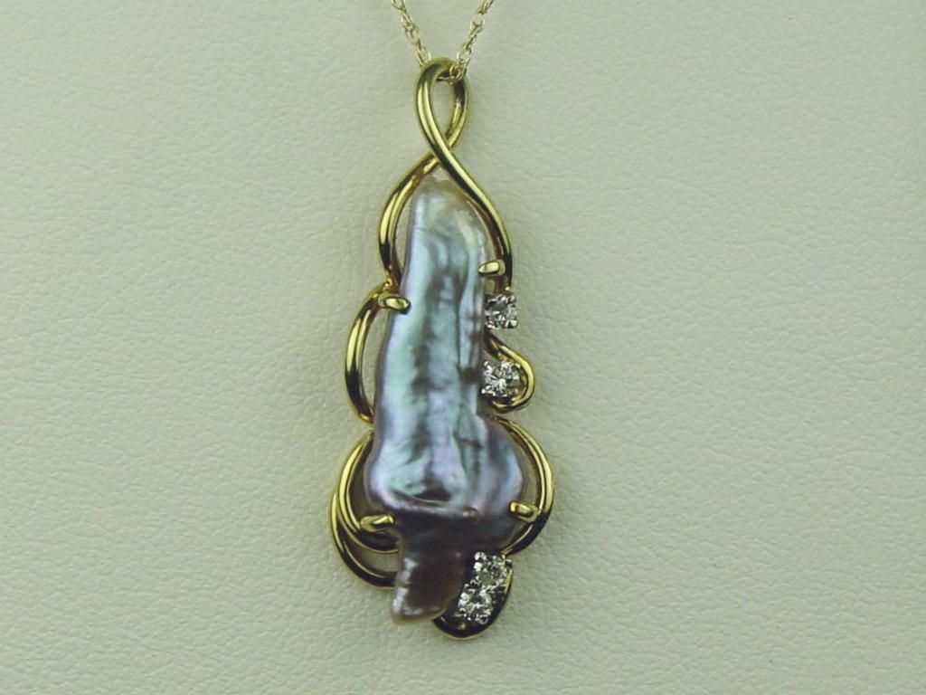 Very Elegant 14K YG Ladies Handmade Pendant Set with a fine freeform design baroque pearl and 4 side diamonds. Retail $1,250.00Set with a fine freeform design baroque pearl and 4 side diamonds. Retail $1,250.00