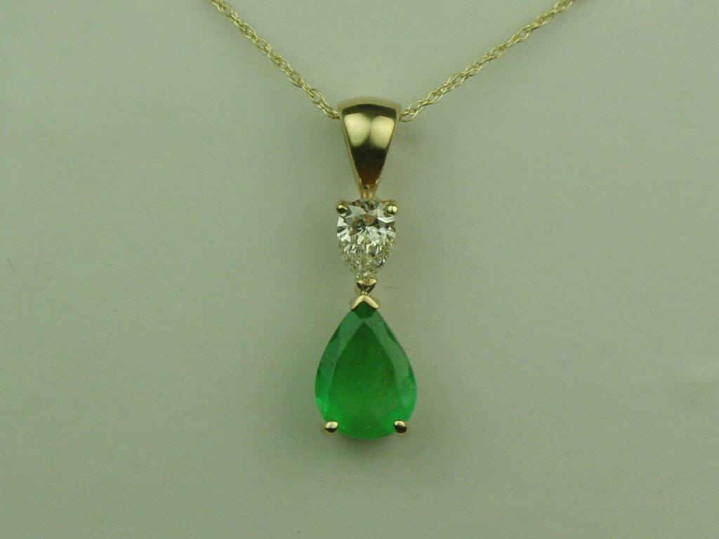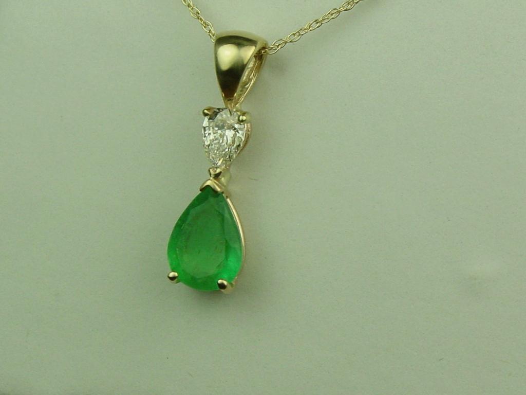 Very Fine 14K YG Ladies Handmade Pendant Set with a center pear shape fern green Emerald weighing approx. 1.00 carat and side pear shape diamond weighing approx. 0.30 carats of G-H color and VS/SI clarity. Retail: $2,850.00Set with a center pear shape fern green Emerald weighing approx. 1.00 carat and side pear shape diamond weighing approx. 0.30 carats of G-H color and VS/SI clarity. Retail: $2,850.00