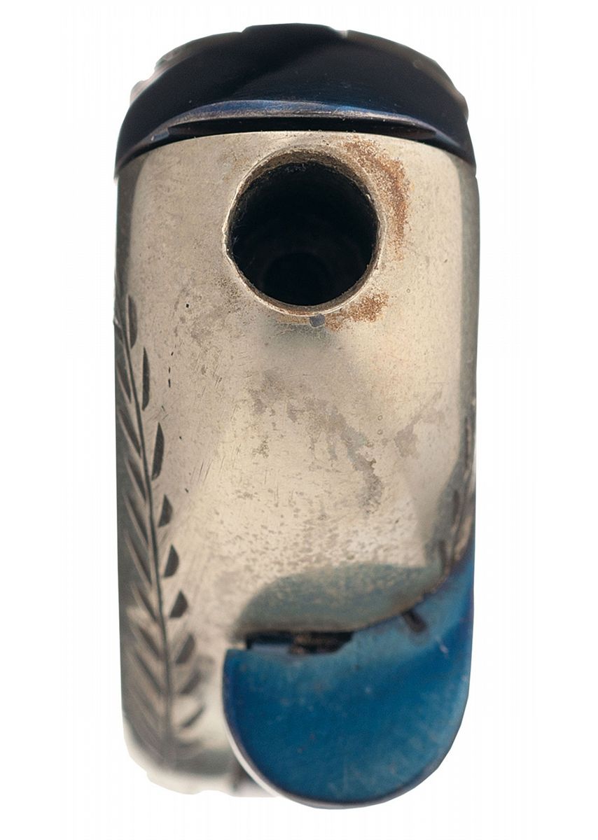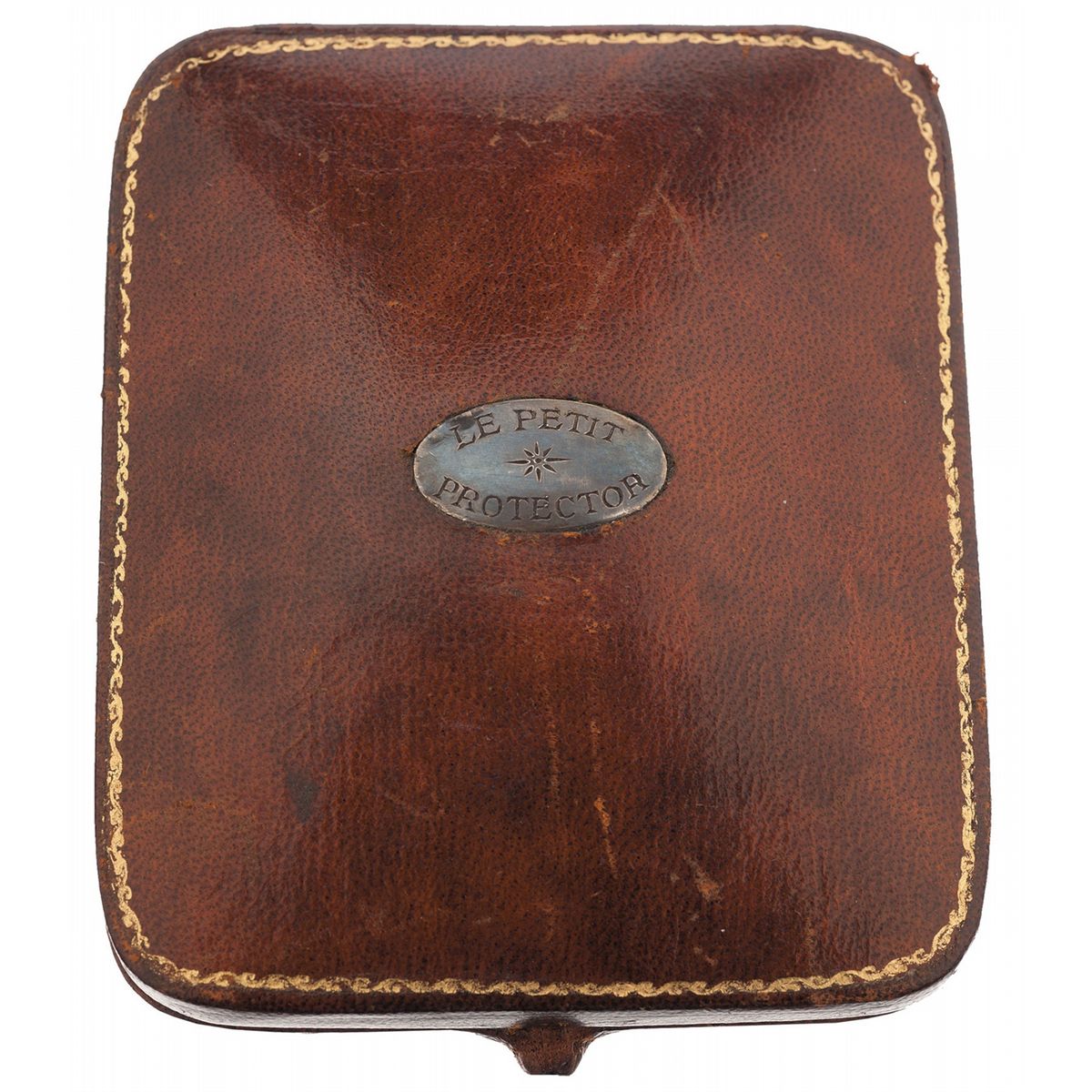 This is a unique example of a French single shot percussion ring gun. The band of the ring is marked "LE PETIT PROTECTOR" flanked by a light floral engraving. German silver with the small parts blue finished iron. The case has a Le Petit Protector silver oval maker plate on top of the lid. The interior of the case is lined in blue velvet and the inside of the lid is lined in silk with a Winsor Bishop label. The case also holds a brush and screwdriver.