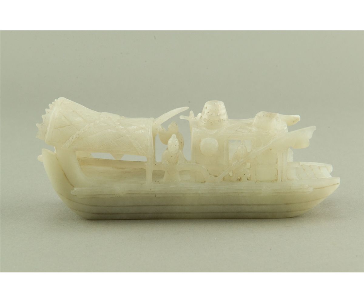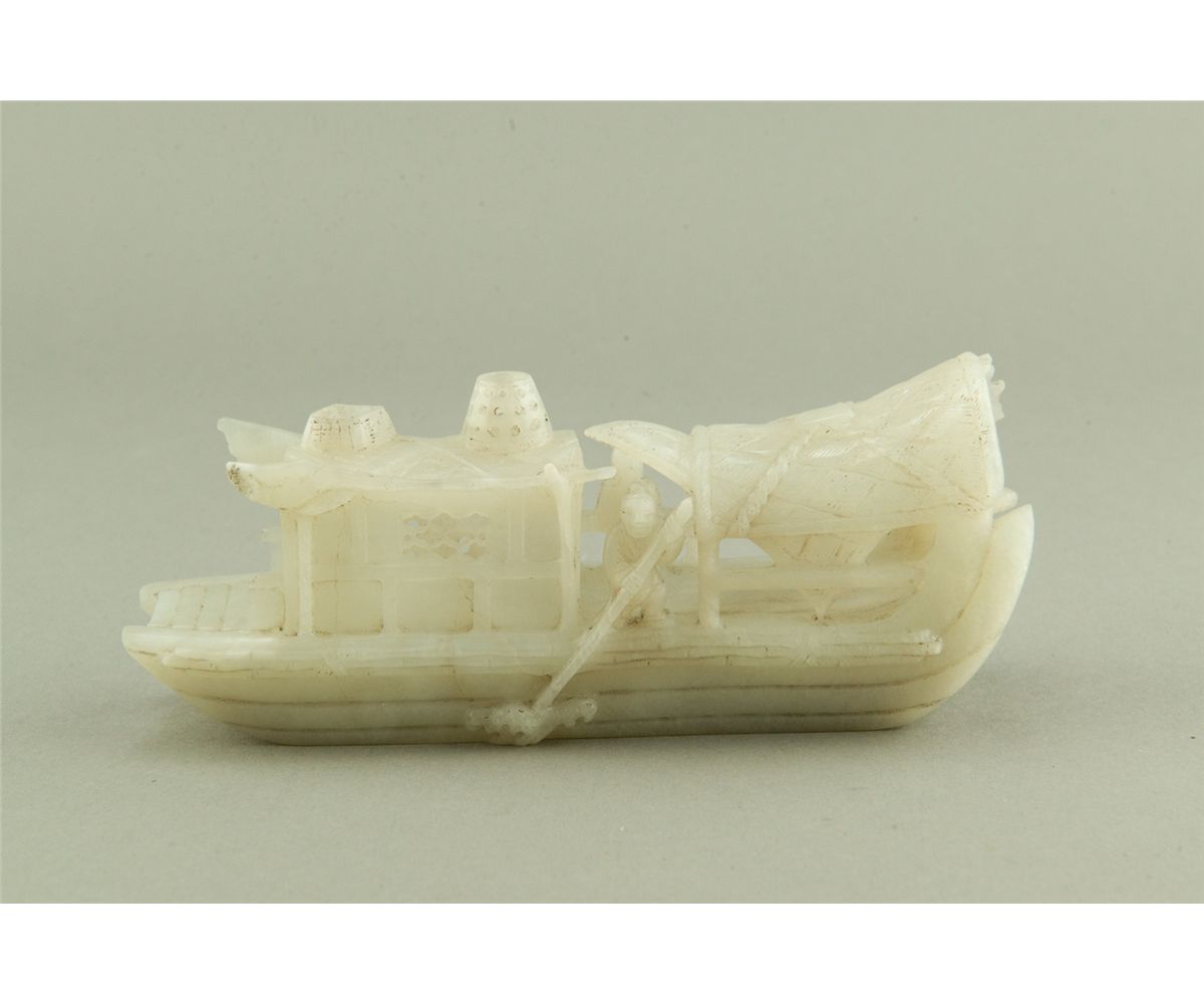 Finely carved in high relief an ancient boat of near perfect quality white jade stone, with open works windows and chimney, low relief and well-carved details. H: 6 cm, L: 17 cm, 485 grams.