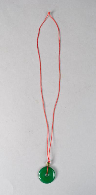 Circular disc with pierced center hole, the stone a deep emerald color with a very fine polish, strung with red cord, 1.125"D, 11"Long with cord, circa early 20th century.