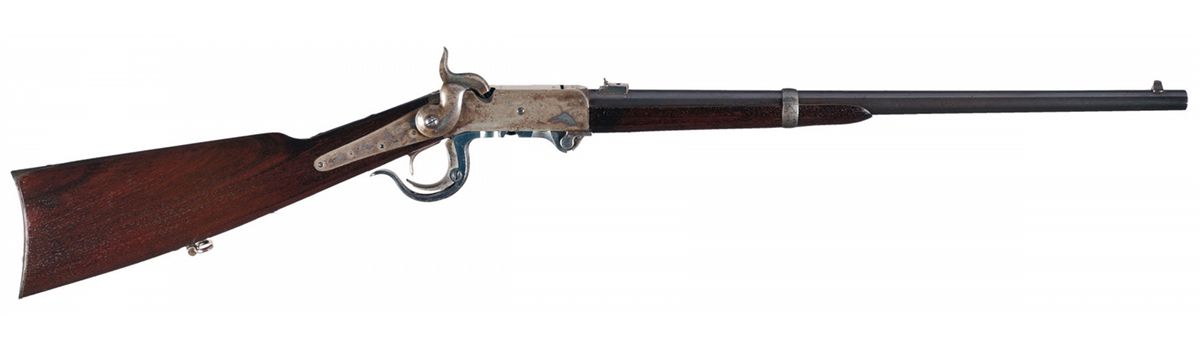 Manufactured 1863-1865. The Burnside Carbine was designed by Federal General Ambrose E. Burnside before the Civil War and was one of the most widely issued and successful Federal cavalry carbines. This Fifth Model carbine has the distinctive guide screw in the right side of the receiver . The top of the receiver is marked "BURNSIDE PATENT/MODEL OF 1864", "CAST STEEL" ahead of the rear sight and the lock is marked "BURNSIDE RIFLE CO./PROVIDENCE=R.I." There is an "R" and "H" inspection mark on various parts. The matching serial number is marked on the top of the breech block and frame. Pinched blade front sight and two leaf rear sight with graduations for 100, 300 and 500 yards. A cavalry sling bar and ring are mounted on the left side of the receiver. The barrel has a dull military blue finish, the breech block, lever and receiver tangs are niter blue, and the receiver, hammer, barrel band, lock plate and buttplate are casehardened. Mounted with a smooth walnut forearm and straight grip stock with two clear boxed cartouches on the left wrist and small inspection stamp on the comb just ahead of the buttplate tang and on the bottom of the forearm.