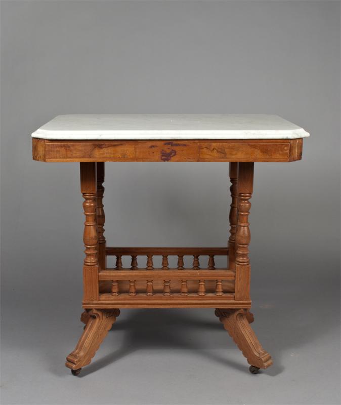 Fine Late 19th Century Victorian parlor/lamp table with railed bottom shelf and carved floral sides, resting on four castors with custom marble top in with with gray inclusions. 29.75" H x 30" W x 22.25" D.