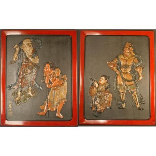 Late Edo Period 19th Century important pair of very large Japanese Carved Lacquered Panels. This work of art is of the highest museum quality. Works like these are usefully found in only in major museums and prominent private art collections. We are proud to offer this spectacular masterpiece. They feature four mythological and historical figures in relief, lacquered in the most amazing techniques. Framed with beautiful red lacquer that is part of the panel. 41.5 inches (105.5 cm)h x 33 inches (84 cm)w. Excellent Condition. From a prominent and widely exhibited collection.