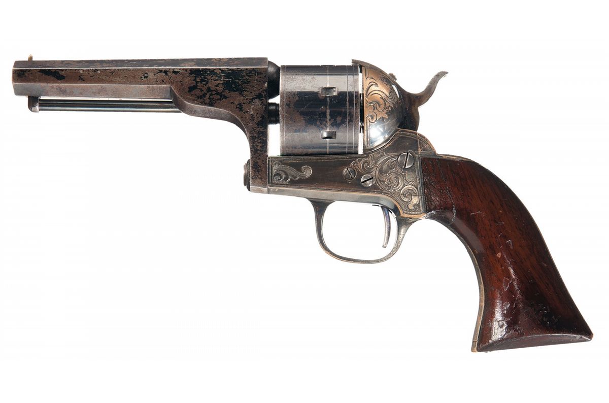 Condition: Very fine. The barrel and cylinder retain 50% original high polish blue finish with flaking loss from age not use, and showing an attractive smooth brown patina on the balance. The hammer retains 60% original beautiful case colors, concentrated on the left side. The remaining parts retain 70% original age darkened silver plating with an aged patina on the exposed brass. The grip is good with a repaired crack on the upper left side, 85% original varnish remaining and some scattered minor dents and dings. The markings and engraving are crisp and clear. The action is excellent.