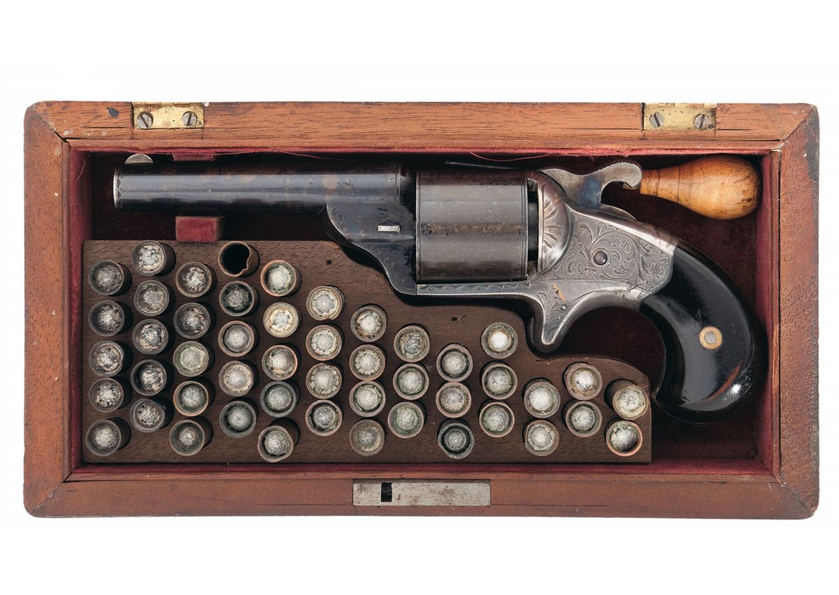 Manufactured from 1864 to 1870 these front loading teat-fire revolvers were one of the most successful competitors to Smith & Wesson and it is believed that their strong sales was one of the reasons for Colt's purchase of the National Arms Co. (Moore's successor) in 1870. The top of the barrel is marked "MOORE'S PAT. ARMS CO. BROOKLYN N.Y." and "D. WILLIAMSON'S PATENT JANUARY 5, 1864" is marked around the rear edge of the cylinder. The frame and butt are nicely scroll engraved with a punch dot background on the frame sides. Blue with silver plated frame, casehardened hammer and smooth dark rosewood grips. The original walnut case is lined with maroon velvet and holds a block for 48 cartridges which has 48 original flat teat cartridges. The revolver retains a very rare original ejector rod.
