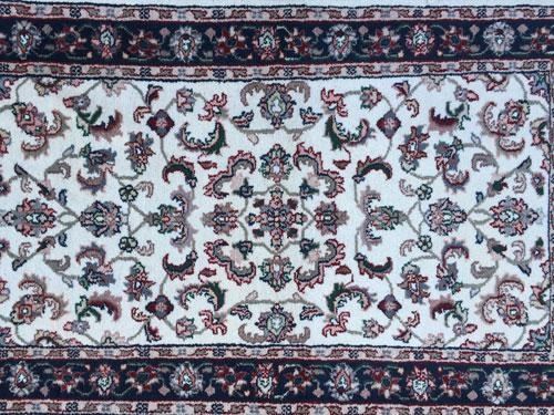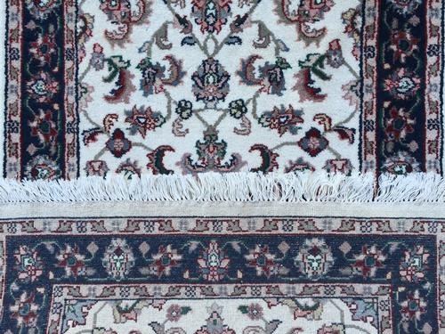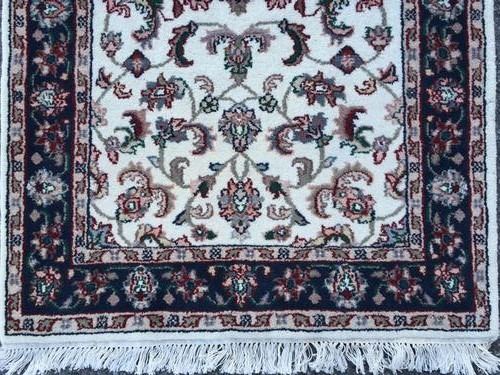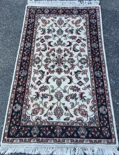 Very Fine Hand Made High Quality Kashan Design Rug. 100%Natural, vegetable dye, hand woven, baby lamb's wool pile on cotton foundation. This is an exquisite Kashan of Shah- Abbasi floral design on a beige background with an understated medallion, contrasted and framed by a deep navy border. This lovely Kashan has a fairly lush pile. Size: 5 feet X 3 feet . Country of origin: Nepal.