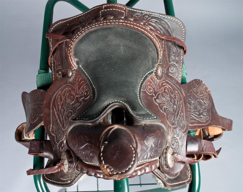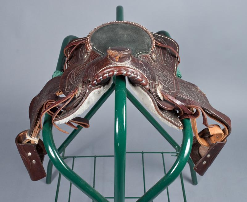 Small saddle with black suede seat, tooled leather on skirt and fenders. 7" seat size, wear to horn.