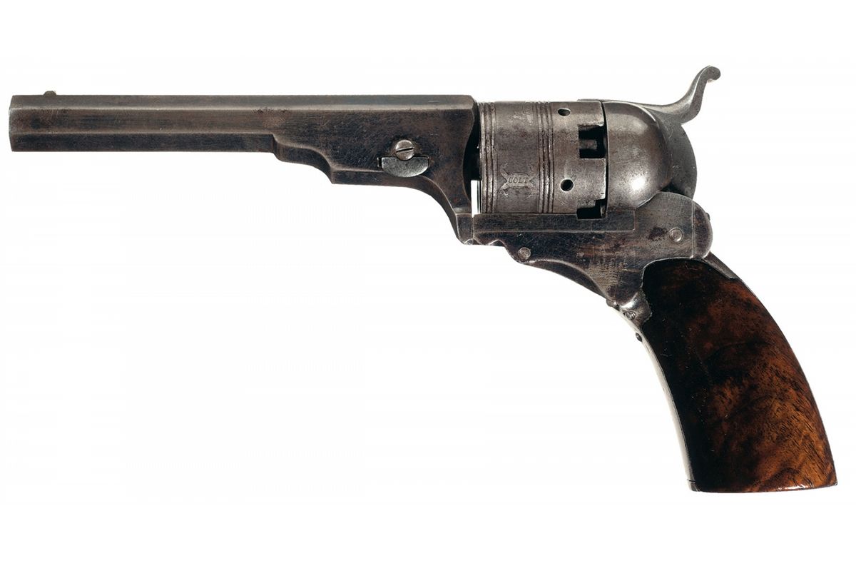 Condition: Fine. The revolver retains 40% of the original blue finish in protected areas. The balance of the revolver has a smooth blue-gray age patina. The barrel markings are crisp. The cylinder has 90% or more of the Centaur scene. There is moderate flash pitting on the percussion nipples, the rear of the cylinder face and the sides of the hammer. The grips are very good with traces of the original varnish and minimal handling or storage marks. This revolver is a fine original example of a rare Colt Paterson Belt Model Revolver